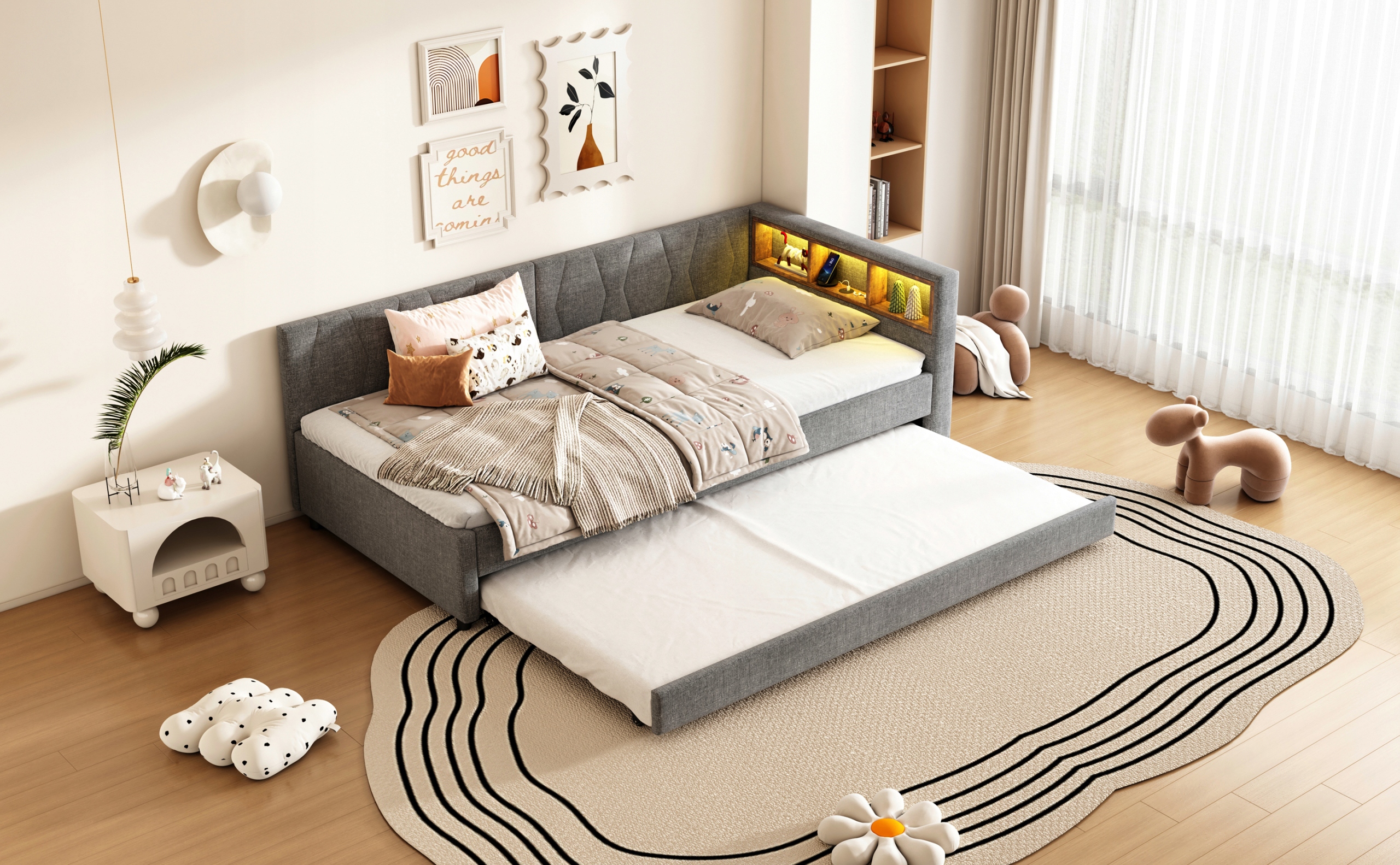 Кушетка, 90 х 200 см, кушетка, диван-кровать, место для хранения вещей на кровати, USB + Type C, светодиодная лента, кровать с раскладушкой, кровать с каркасом (без матраса), белье, серый