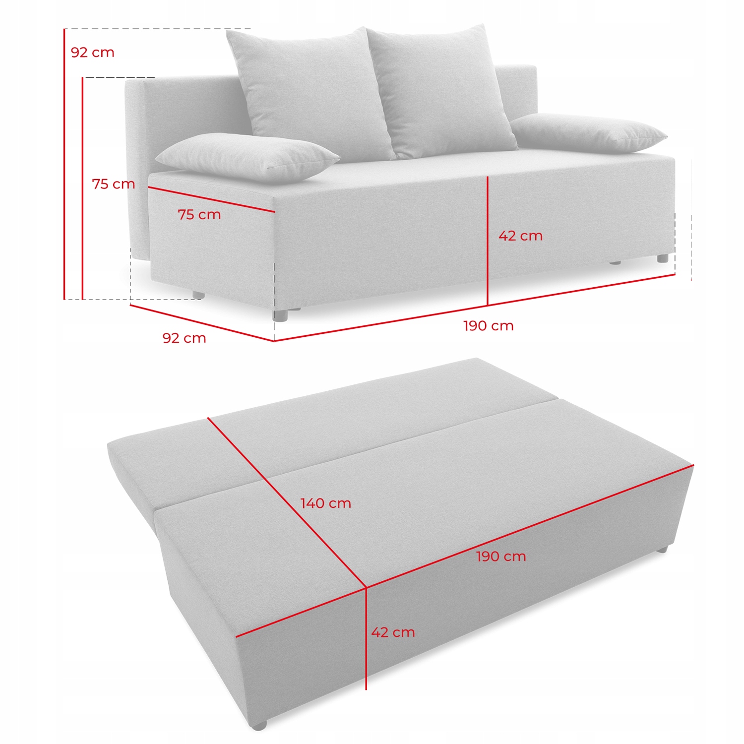 Система раскладывания позволяет эффективно трансформировать диван в удобную кровать размером 140 см х 190 см. Для экономии места и поддержания порядка можно хранить постельное белье, подушки или одеяла в контейнере под сиденьем.