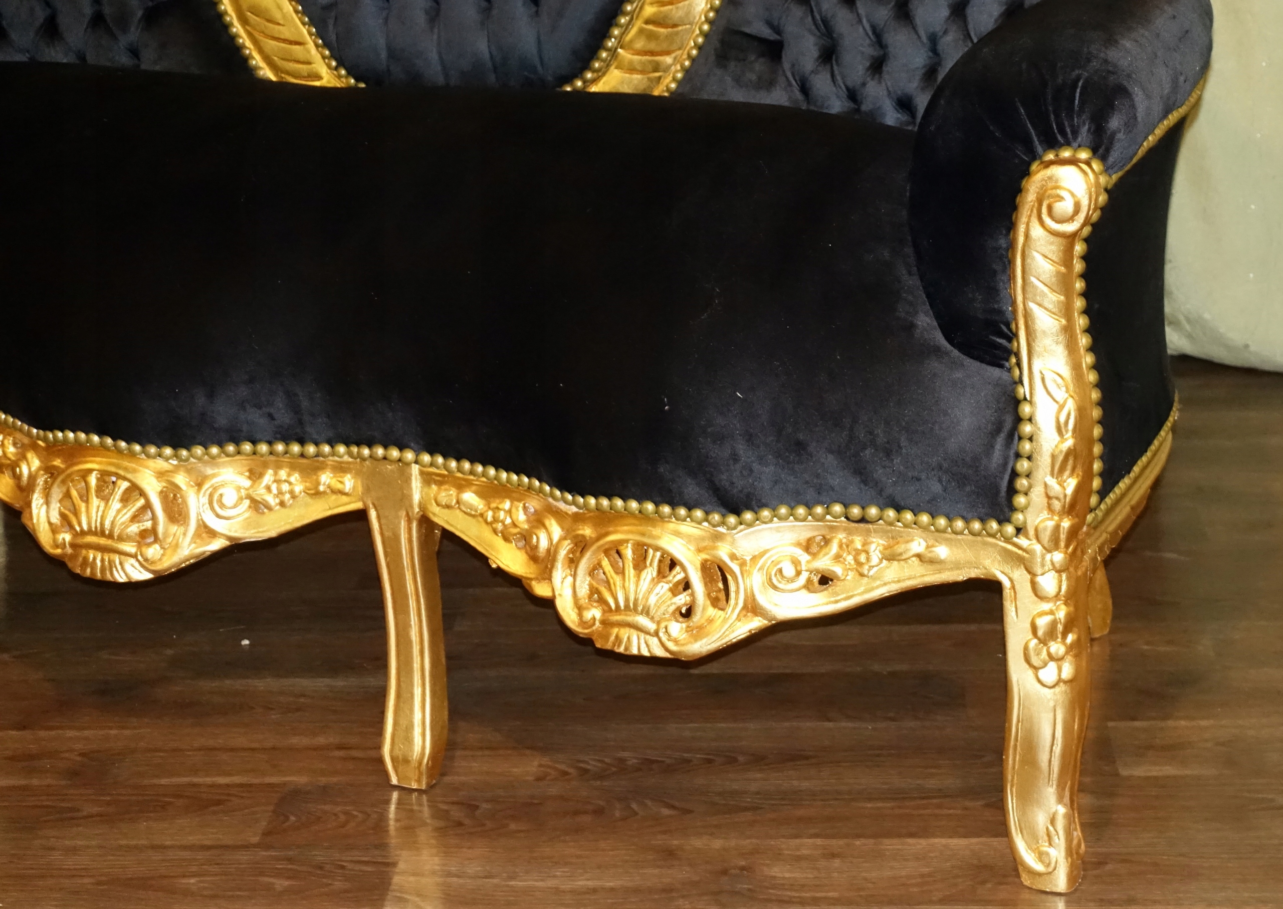 Чудесный диван в стиле барокко. Деревянная конструкция, как и подобает этому стилю, богато украшена золотой резьбой, обивка из черного плюша, со вкусом простегана спинка. Диван новый, но сделан под старину.