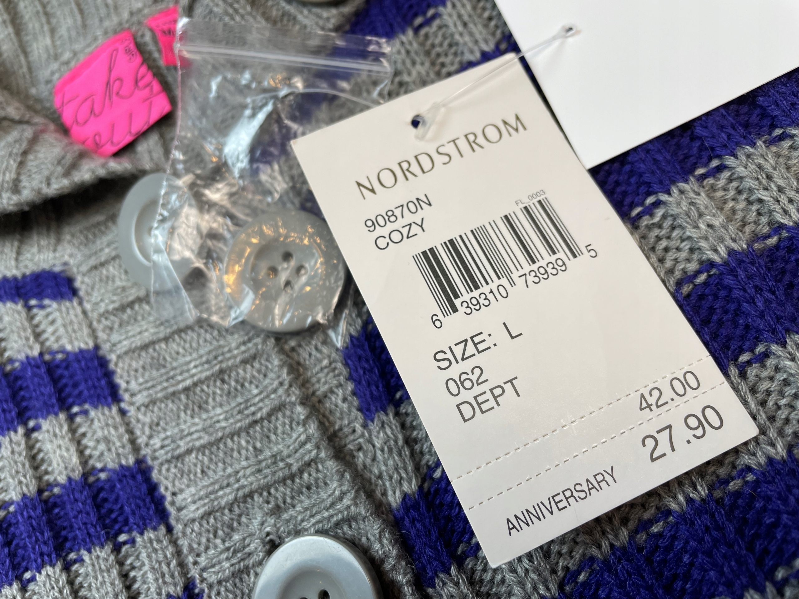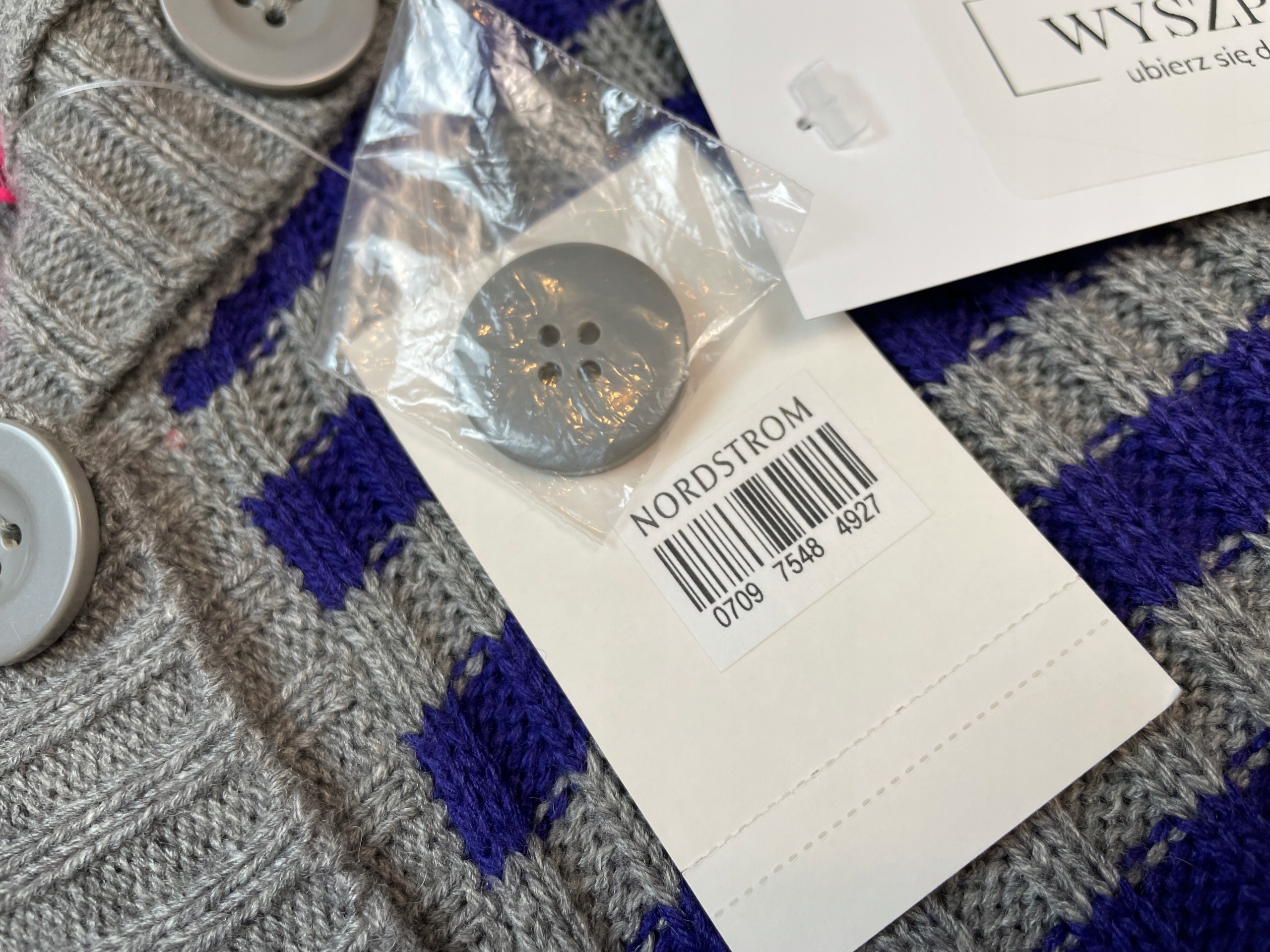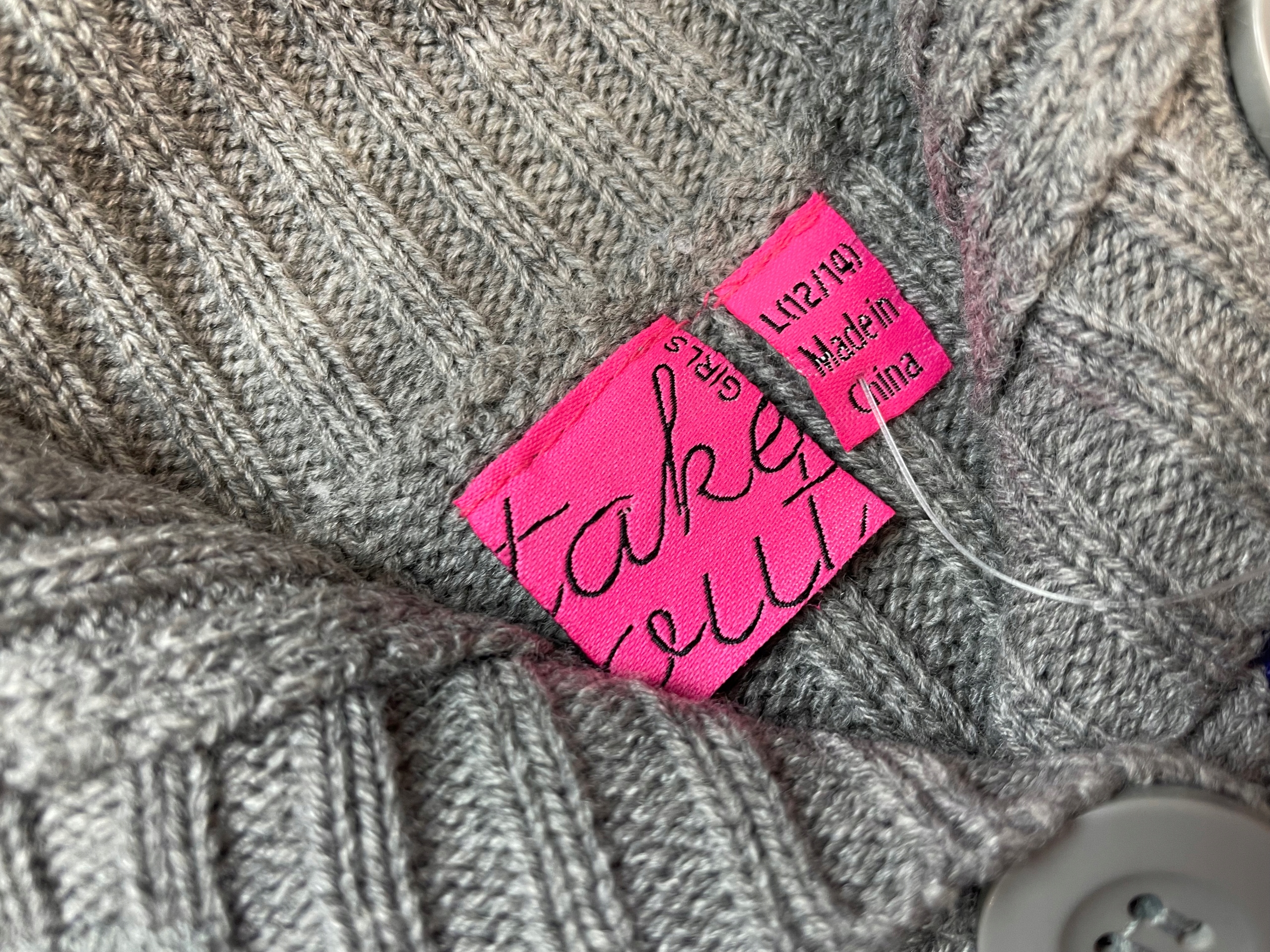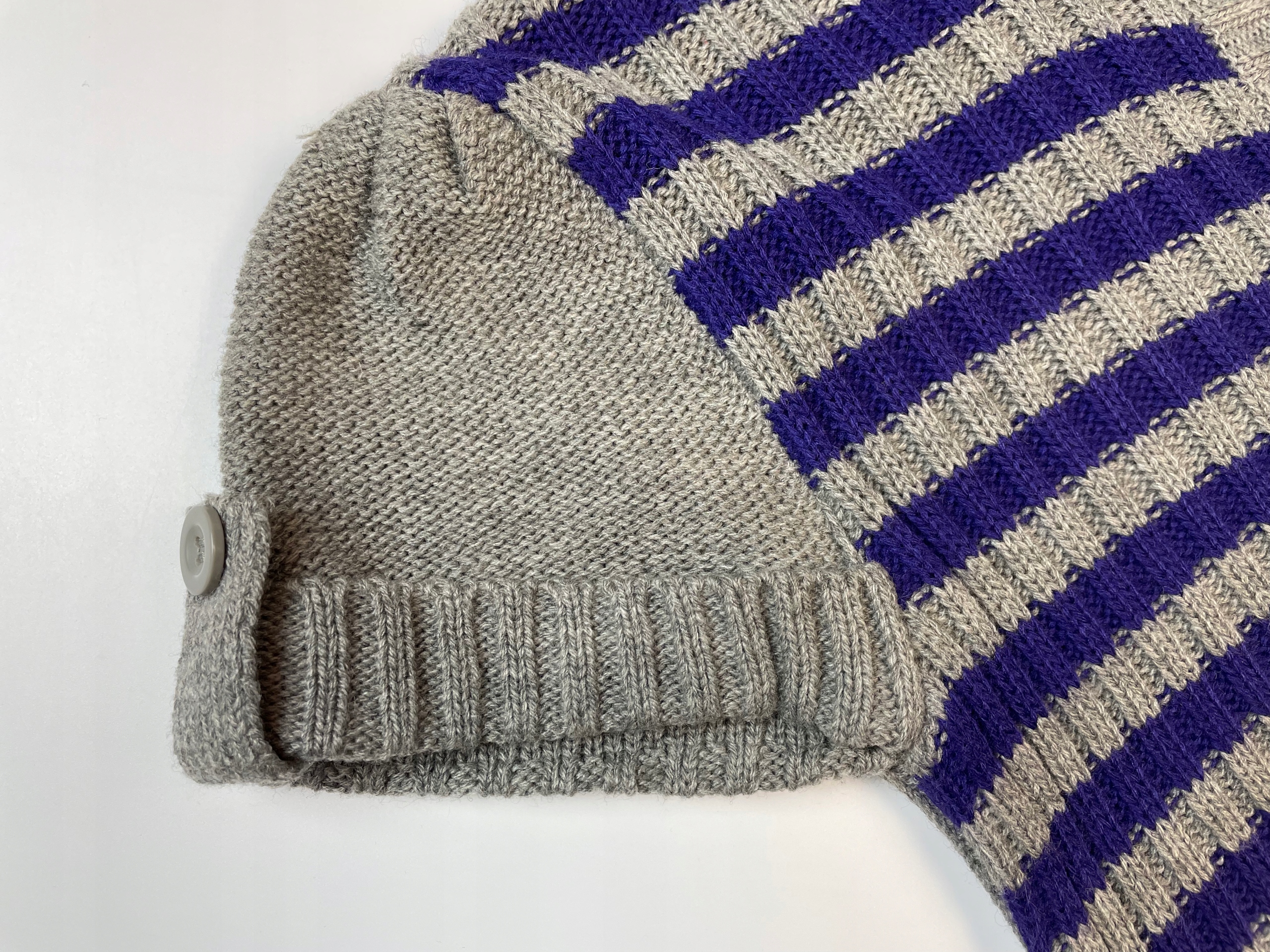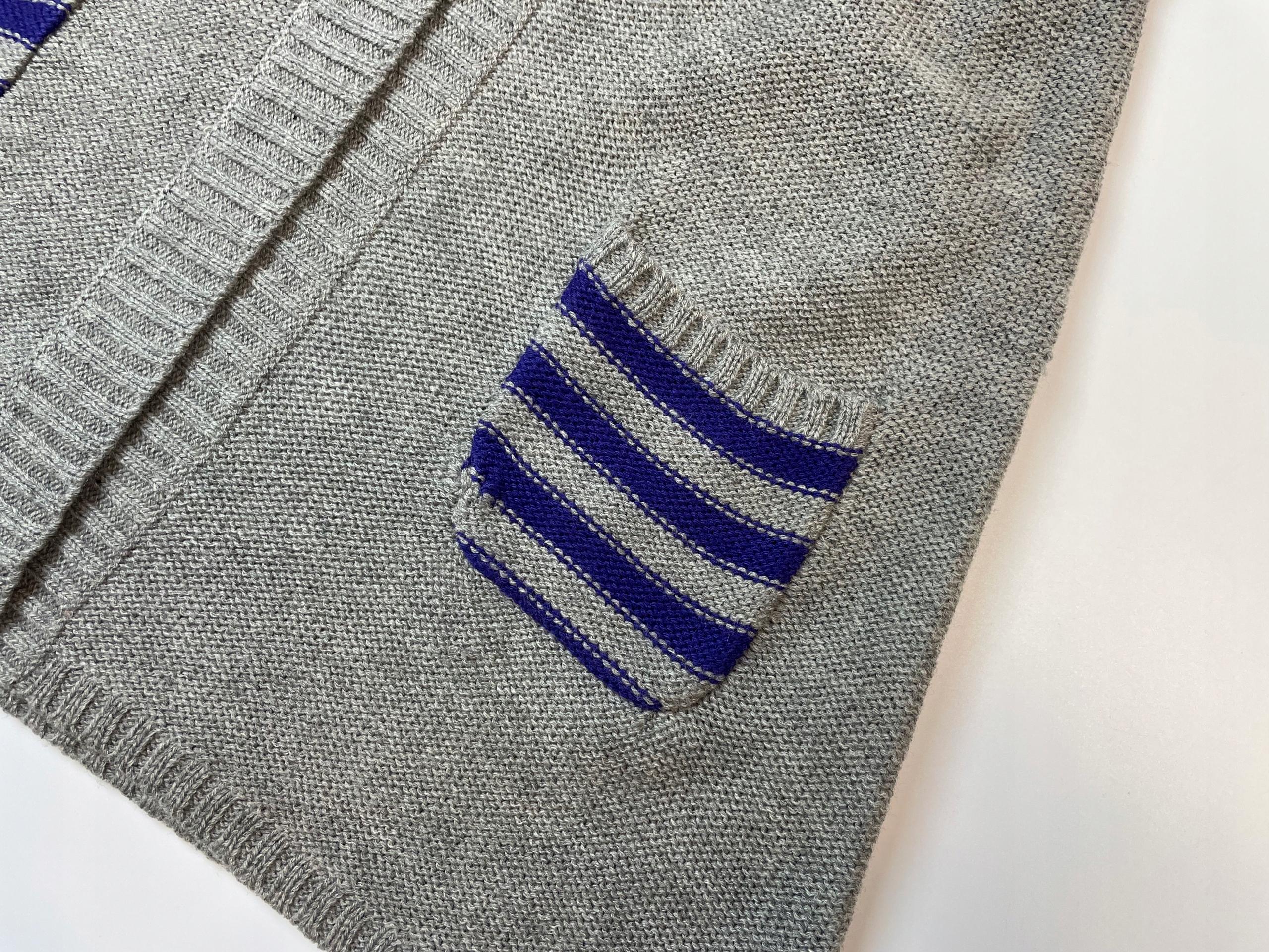 Серый свитер/пальто, украшенный фиолетовыми полосками. Имеет высокий воротник-стойку, который можно использовать как воротник. Свитер имеет классический простой крой. Застегивается сверху на большие пуговицы, ниже пояса свободный. Имеет два кармана внизу. У свитера короткие рукава. Это очень приятно на ощупь. На наш взгляд, это выглядит очень красиво. На свитере имеется запасная пуговица. Состав материала свитера — 86 % акрил и 14 % полиэстер.