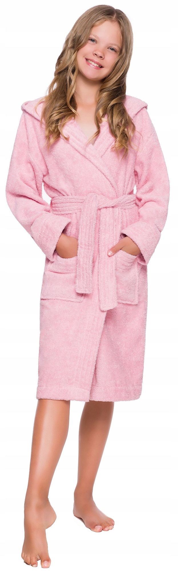 Хороший и удобный халат для девочек - подросток из хлопка с капюшоном, привязанный к талии, с карманами.