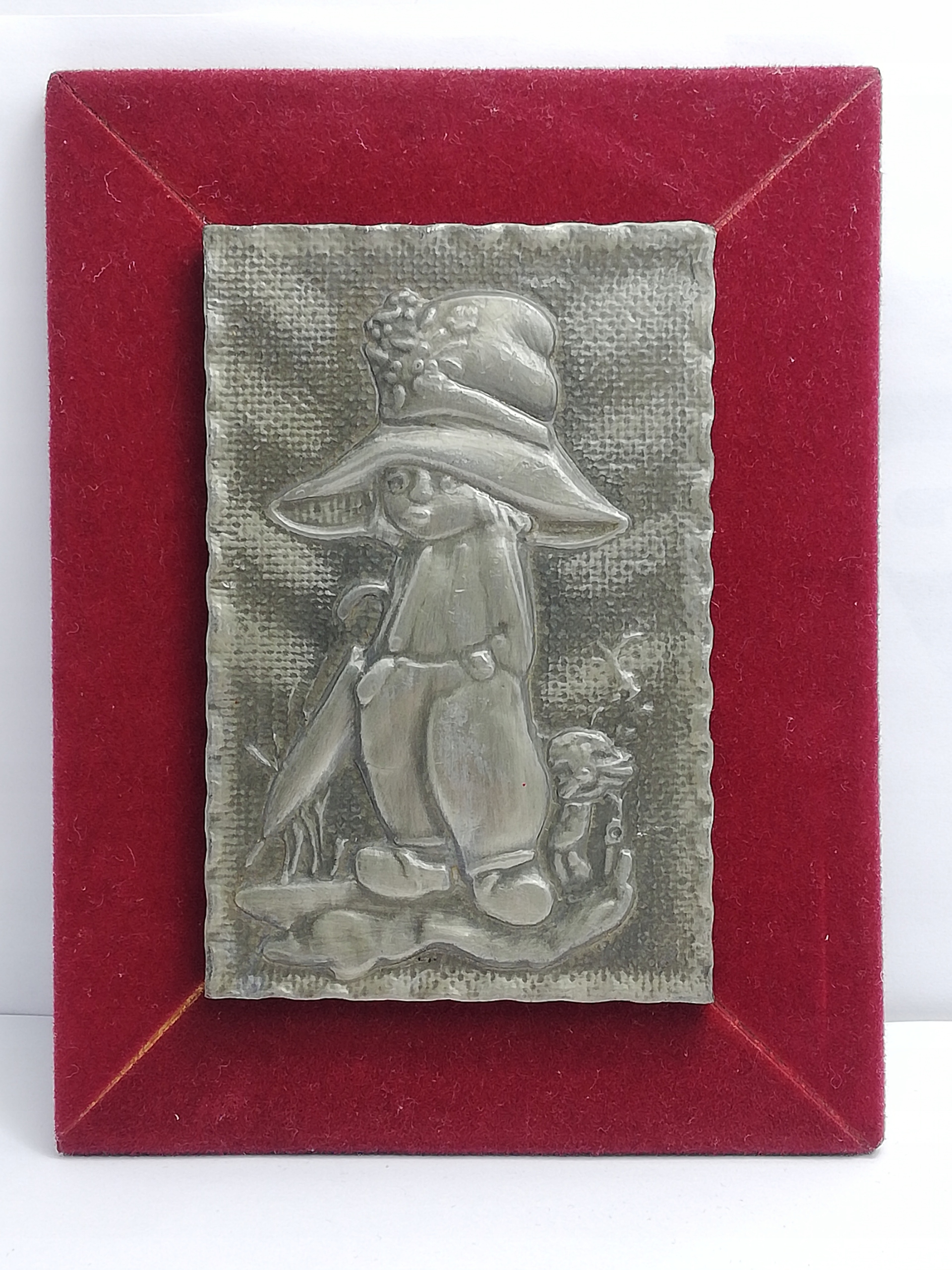 Предмет аукциона/продажи - старинное металлическое изделие/картина, тисненая металлом на доске, покрытой бархатом - Девушка с зонтиком