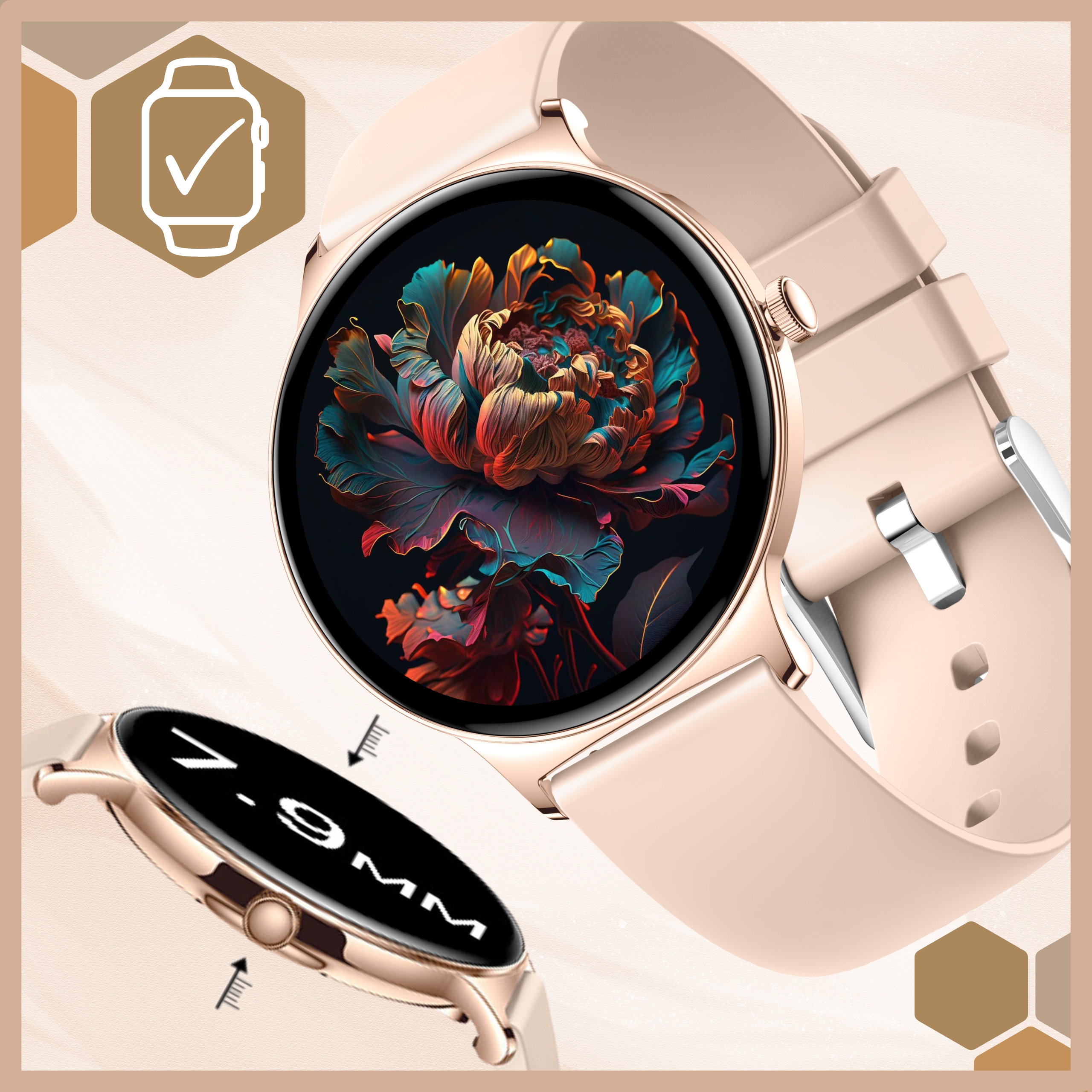 Умные часы выделяются чрезвычайно стройной конверт с толщиной всего 7,9 мм. утомительный. Тонкий дизайн подчеркивает минималистский дизайн часов, придавая ему легкость и универсальный характер - идеально подходит для любого случая.