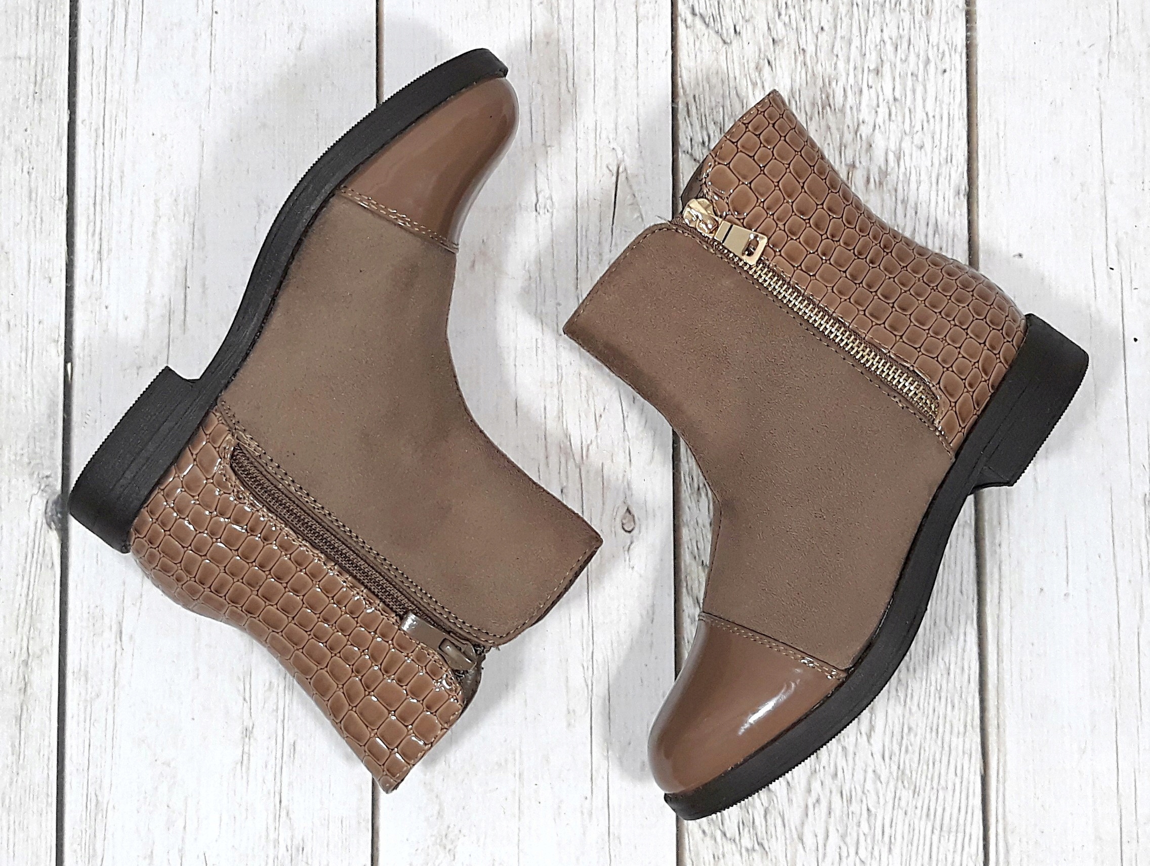 Бежевые ботинки из мягкой экологической замши. Слегка изолирован. Лакированный носок для защиты от намокания. На заднике модный в этом сезоне звериный мотив – имитация крокодиловой кожи. Декоративная молния снаружи. Застежка-молния внутри облегчает надевание обуви.