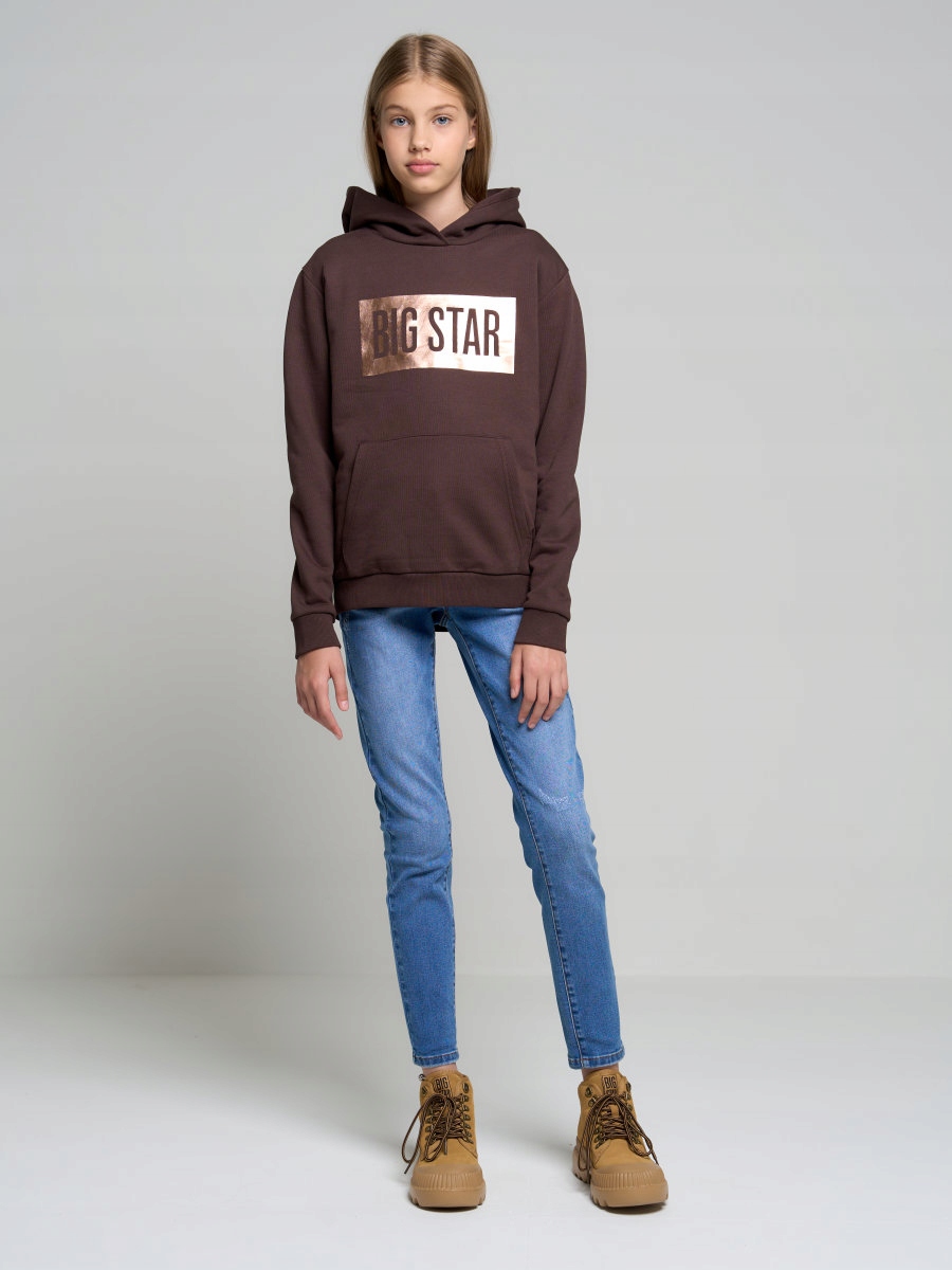 Для активных девушек, которые любят проводить много времени на свежем воздухе, это худи станет идеальным выбором. Он изготовлен из натурального хлопка с флисовой отделкой, приятен на ощупь и очень теплый. Свитшот для девочки подойдет в качестве верхней одежды в прохладные осенние дни. Имеет классический крой, поэтому не стесняет движений. Толстовка от BIG STAR выполнена в теплом коричневом цвете. Ее главным украшением является большой принт из розового золота спереди, который придает ей девичий характер. Толстовка прекрасно сочетается со спортивными штанами ABUELITA 804 той же линии.