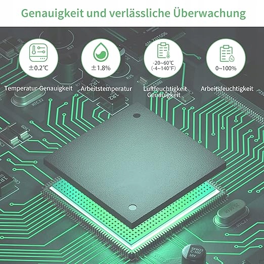 Датчик температуры оснащен очень точными производственными датчиками, которые могут точно отслеживать изменения температуры и влажности. Температура точна до ± 0,2 ° C, а влажность воздуха составляет ± 1,8% относительной влажности. Благодаря этому вы будете регулярно обновляться.