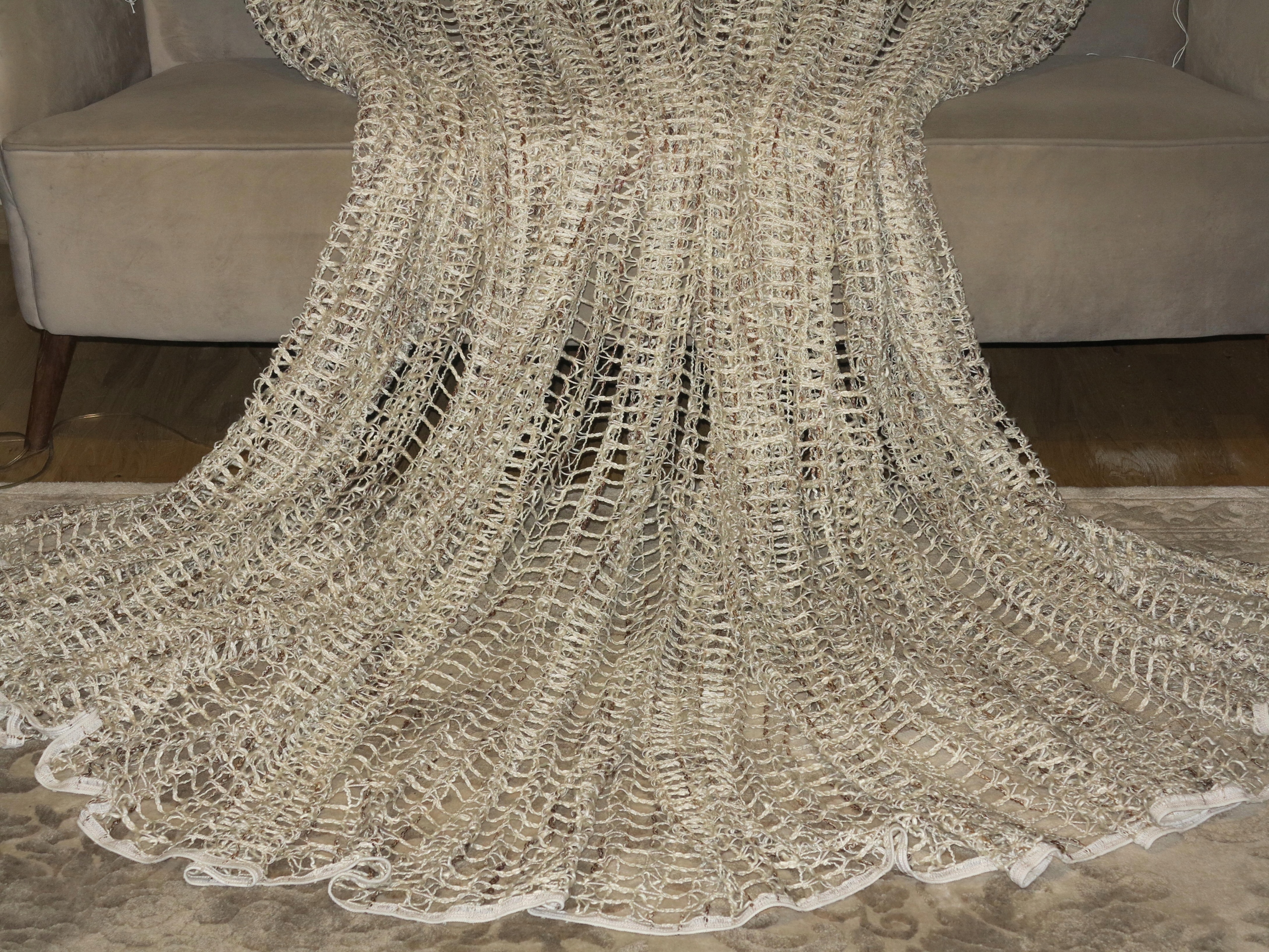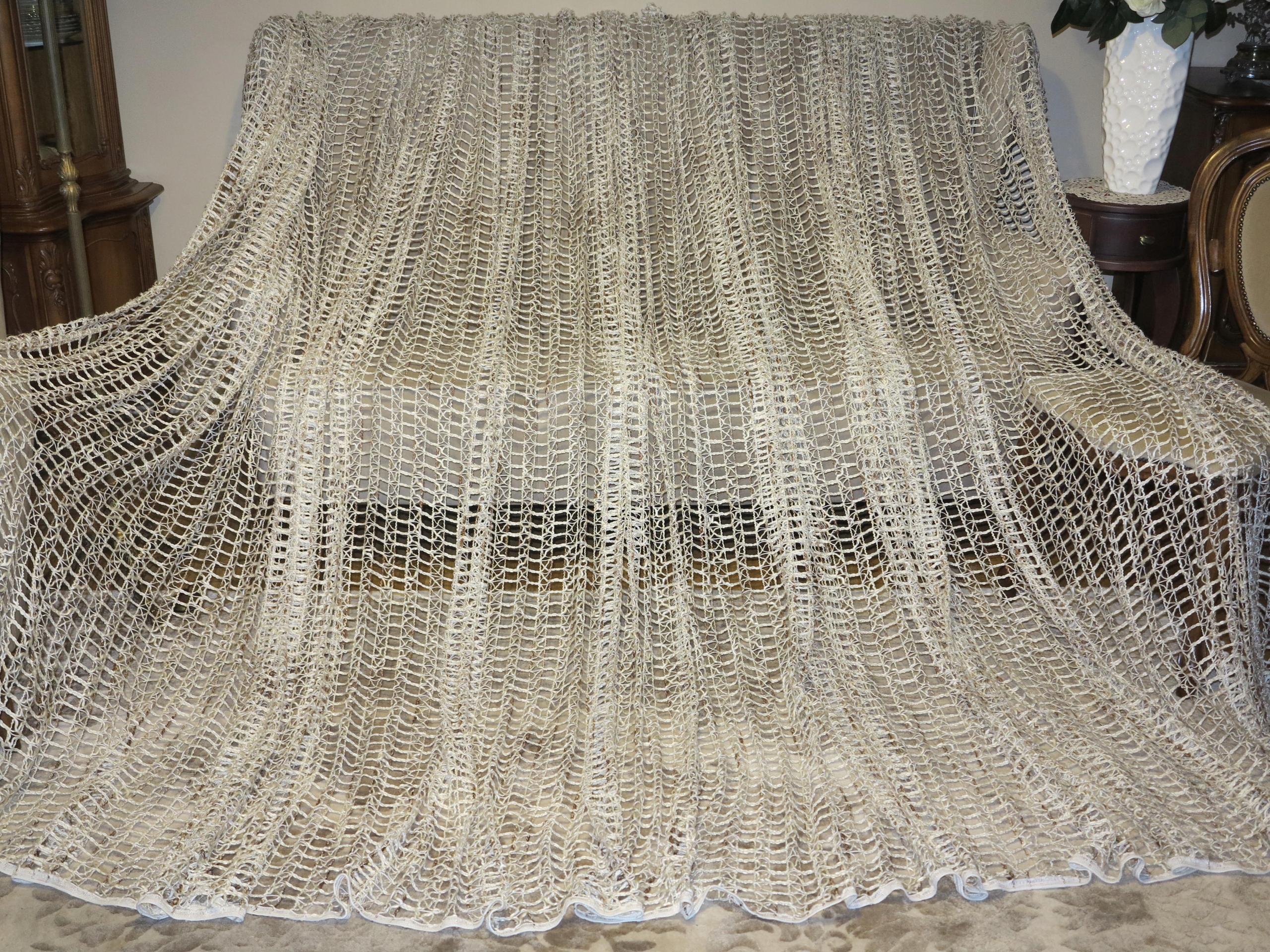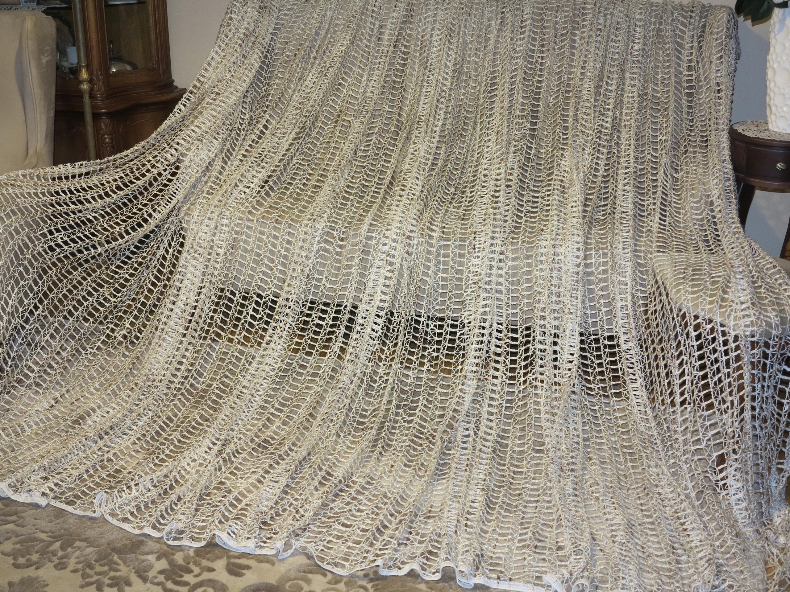 В ПОМЕСТЬЕ - ОТЛИЧНУЮ ШТОРУ, ПОЛНОСТЬЮ ИЗ ВЫСОКОКАЧЕСТВЕННОЙ НЕМЕЦКОЙ ТЯЖЕЛОЙ, ПЛОТНОЙ, струящейся и идеально ниспадающей сетки, С КРУПНЫМИ СЕТОЧКАМИ. ГЛАЗА ВНУТРИ ТОЛСТОЙ НИТЬЮ, КАК БАКЛА. ЦВЕТ НИТКИ - БЕЖЕВЫЙ/ЭКРУ