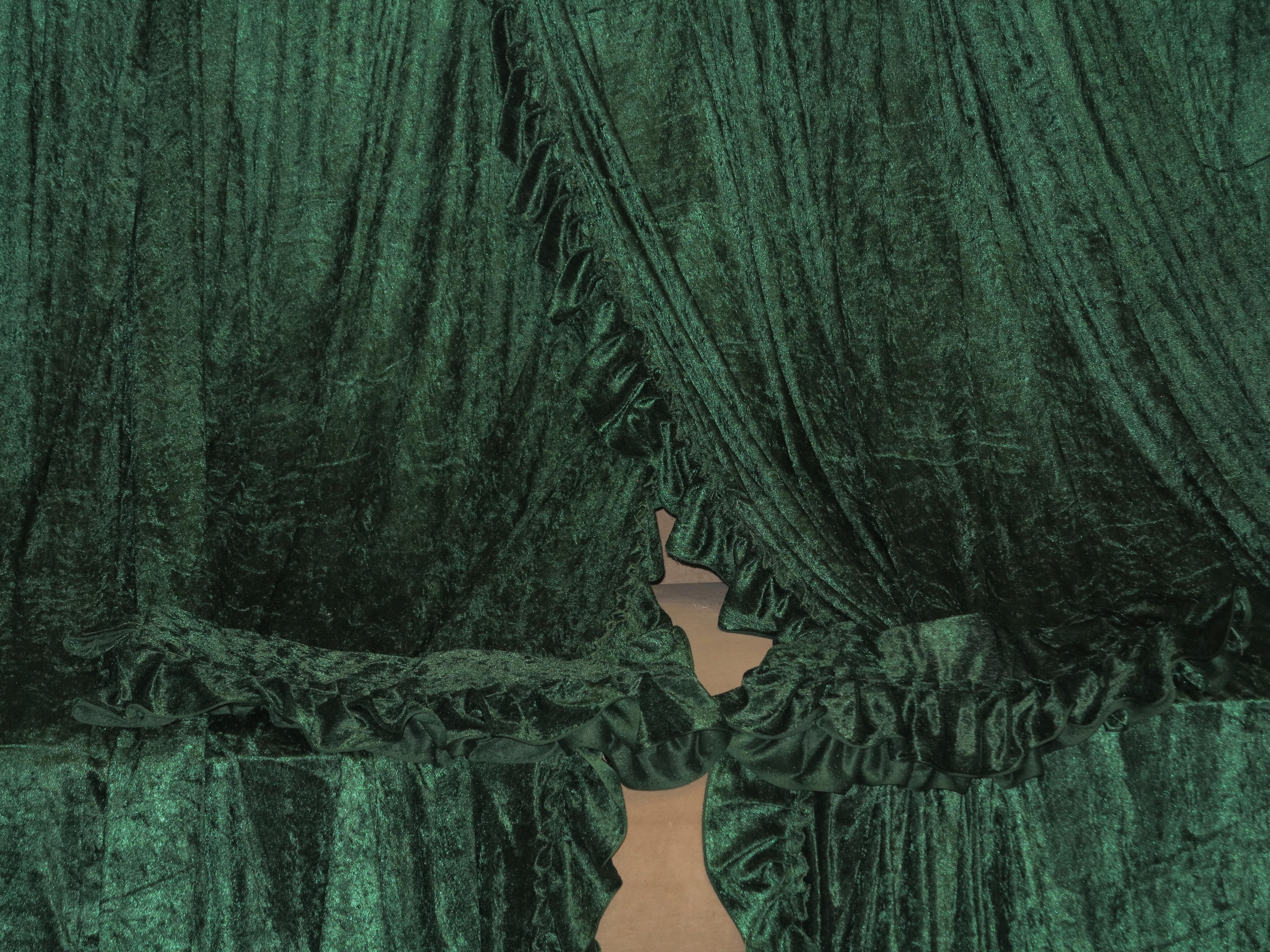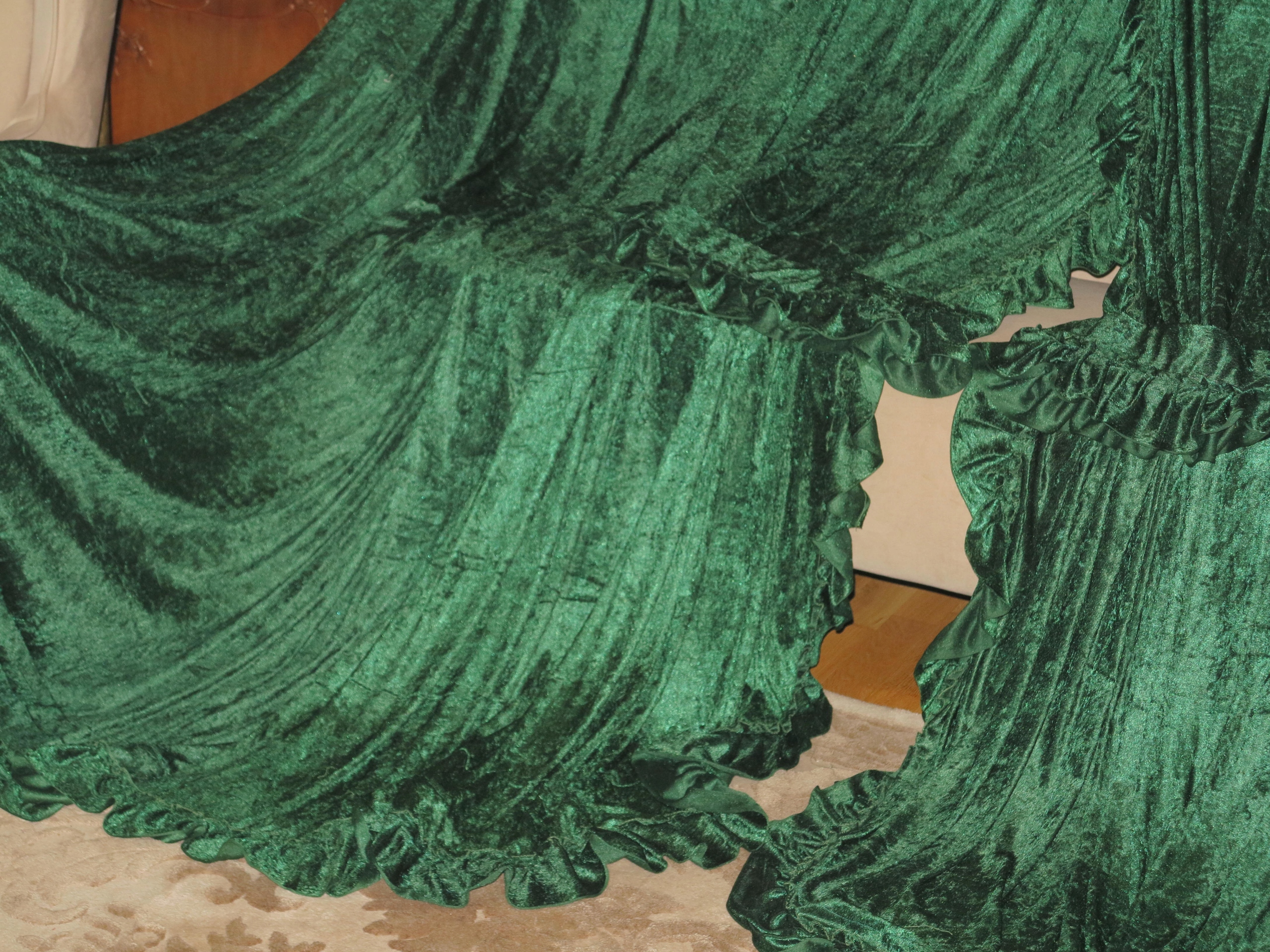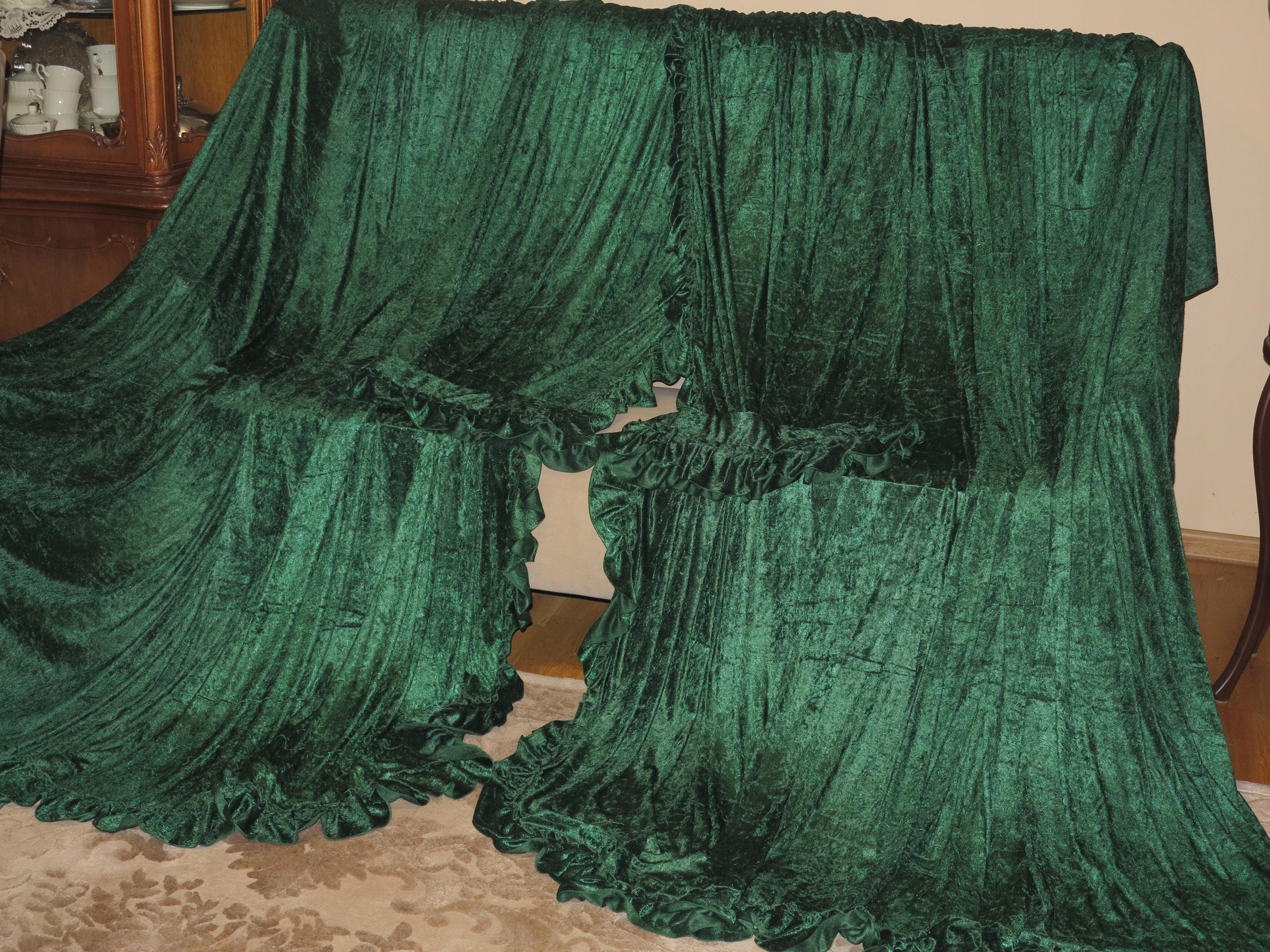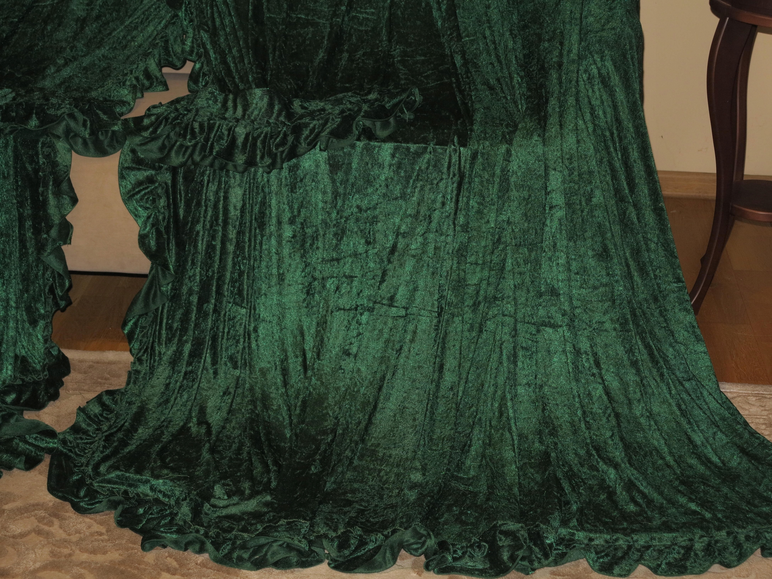 НАБОР КРАСИВЫХ И НЕОБЫЧНО ДЕКОРАТИВНЫХ ШТОР С ВОРОТАМИ И ДЛИННЫМИ ШПИЛЬКАМИ, ИЗ СТРУЯЩЕГО БАРХАТА ИЗУМРУДНО-ЗЕЛЕНОГО ЦВЕТА. ТАКЖЕ С РЮБКАМИ