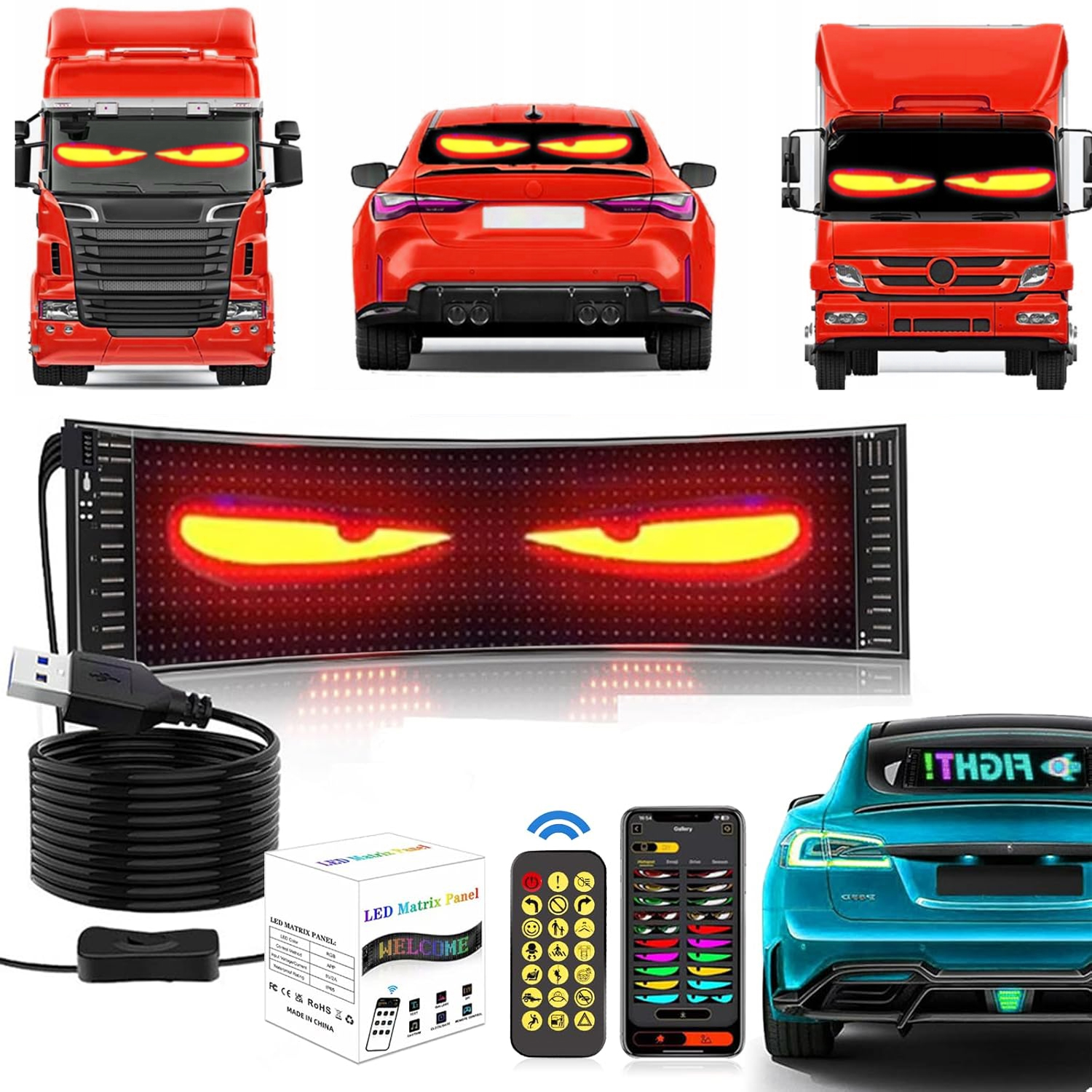 Мягкий экран может контролироваться без усилий, используя выделенное мобильное приложение. Выберите из различных дизайнов глаз или создайте свои собственные DIY и текстовые анимации, чтобы выразить свой уникальный стиль. С толщиной всего 2 см он очень легкий и прост в установке. USB и пульт дистанционного управления В наборе пульт дистанционного управления с кабелем длиной 4,5 м (14,7 фута) для легкой регулировки изнутри автомобиля. Если вы хотите получить более широкий визуальный эффект, вы можете купить два. Выберите правильный размер в зависимости от реальных потребностей автомобиля