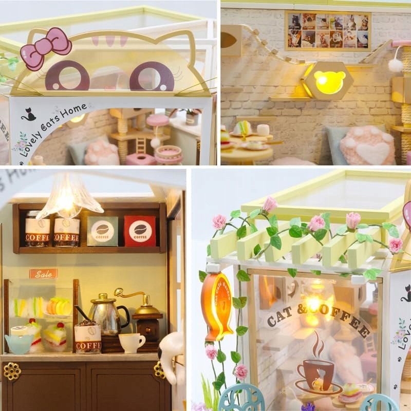 DIY Cat Cafe Миниатюрный кукольный домик со светодиодным освещением h2>