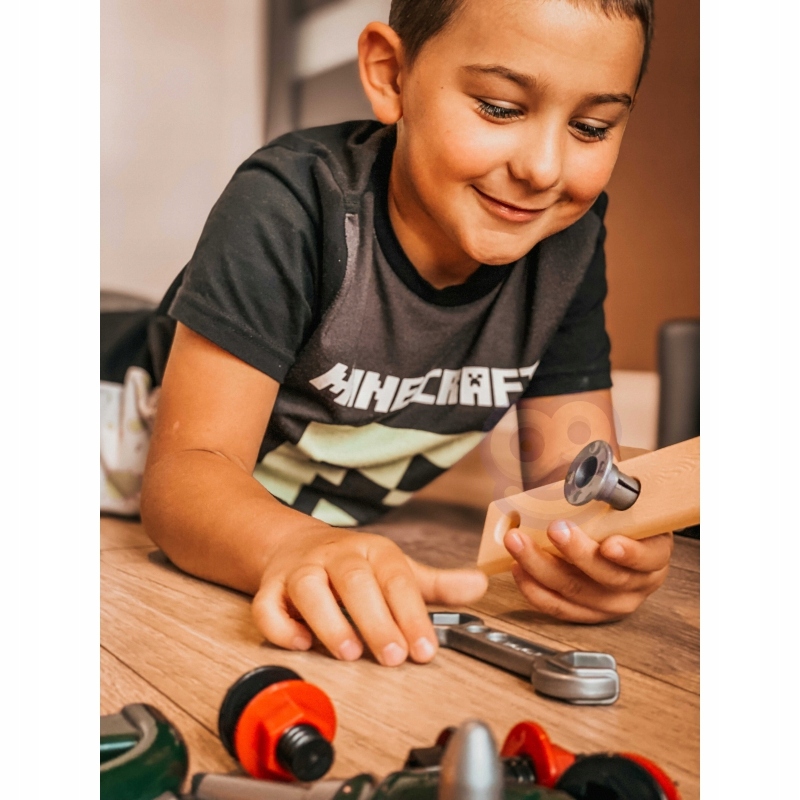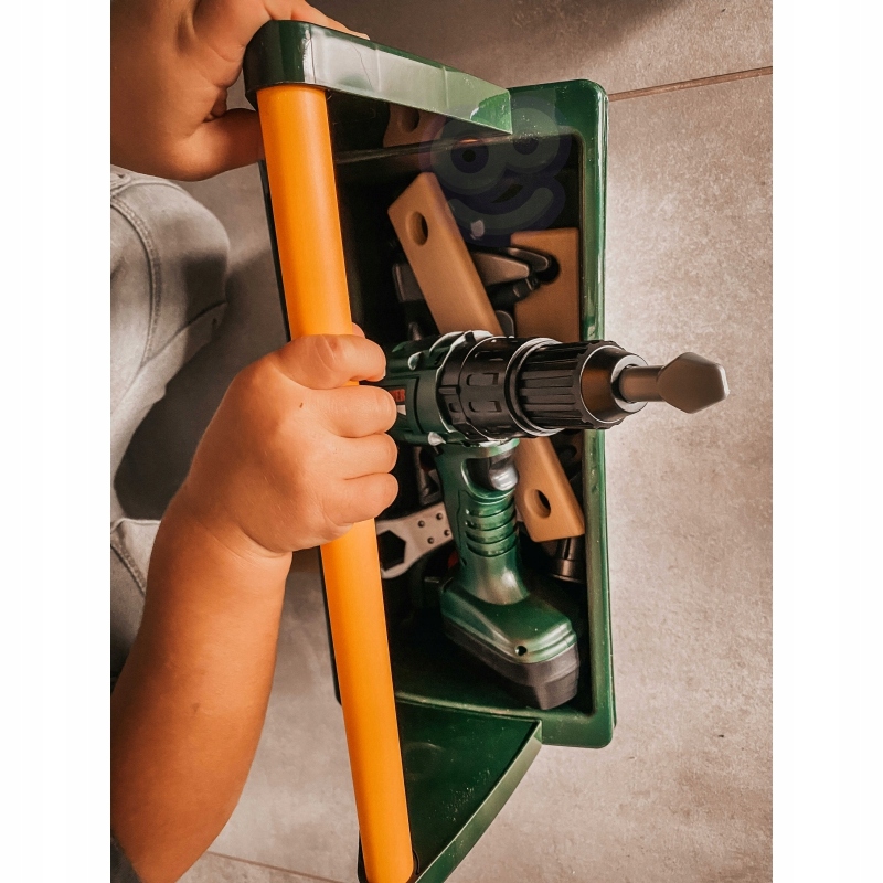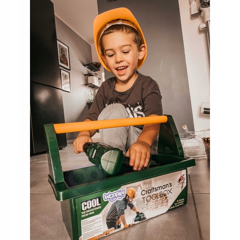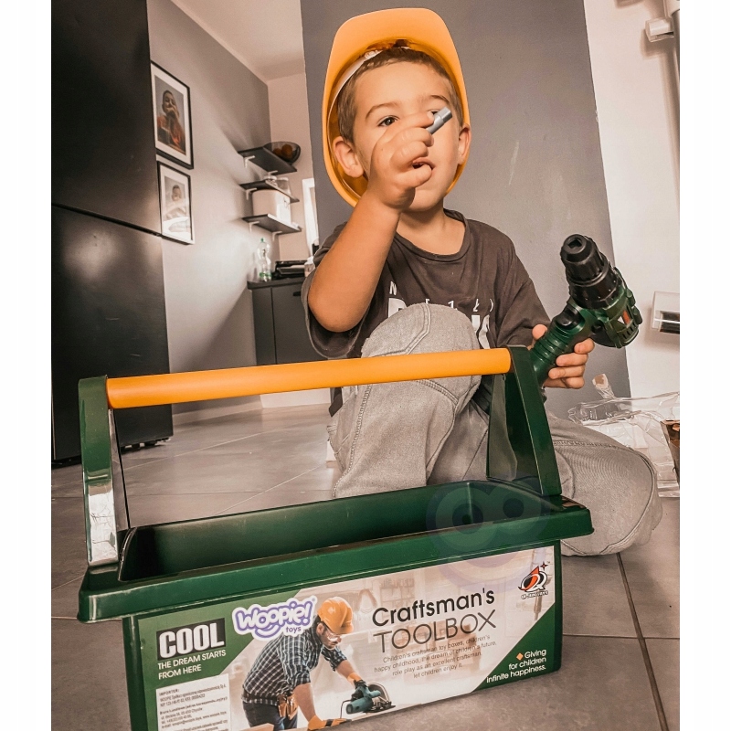 - Ящик для инструментов с отверткой и дрелью создан любимой детьми компанией WOOPIE. В комплект входит темно-зеленый вместительный ящик для инструментов с удобной желтой ручкой и 15 элементов. Среди инструментов дети найдут аккумуляторную отвертку и дрель с тремя сменными насадками. Отвертка/дрель имитирует настоящее устройство благодаря своим звукам и вращающемуся винту. Кроме того, в комплект входят пила с удобной ручкой, молоток, гаечный ключ, две пластиковые доски с отверстиями для вкручивания шурупов (4 в наборе) или забивания гвоздей (2 в наборе). Этот набор доставит массу удовольствия каждому маленькому энтузиасту DIY, а также поможет развитию ручных навыков.