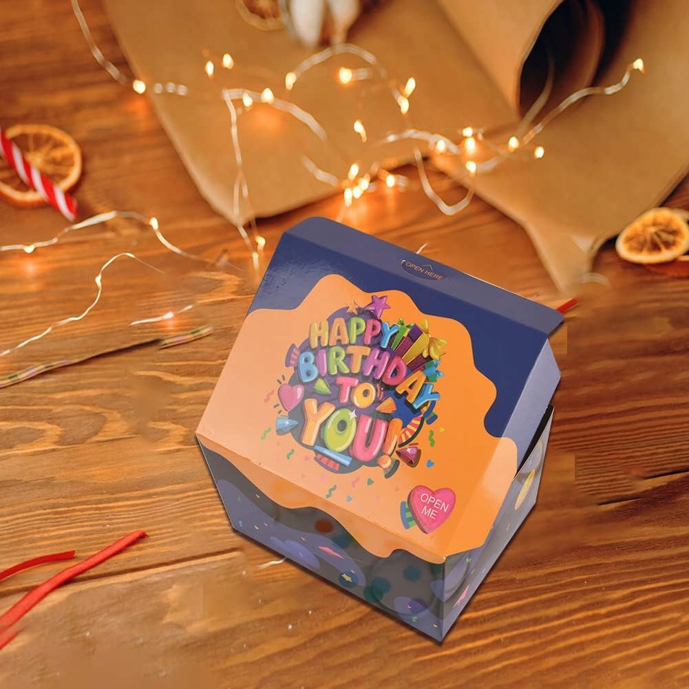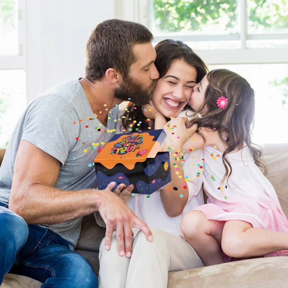 - Благодаря механизму «взрыва» коробка эффектно открывается, выбрасывая конфетти и даря получателю радость и улыбку
