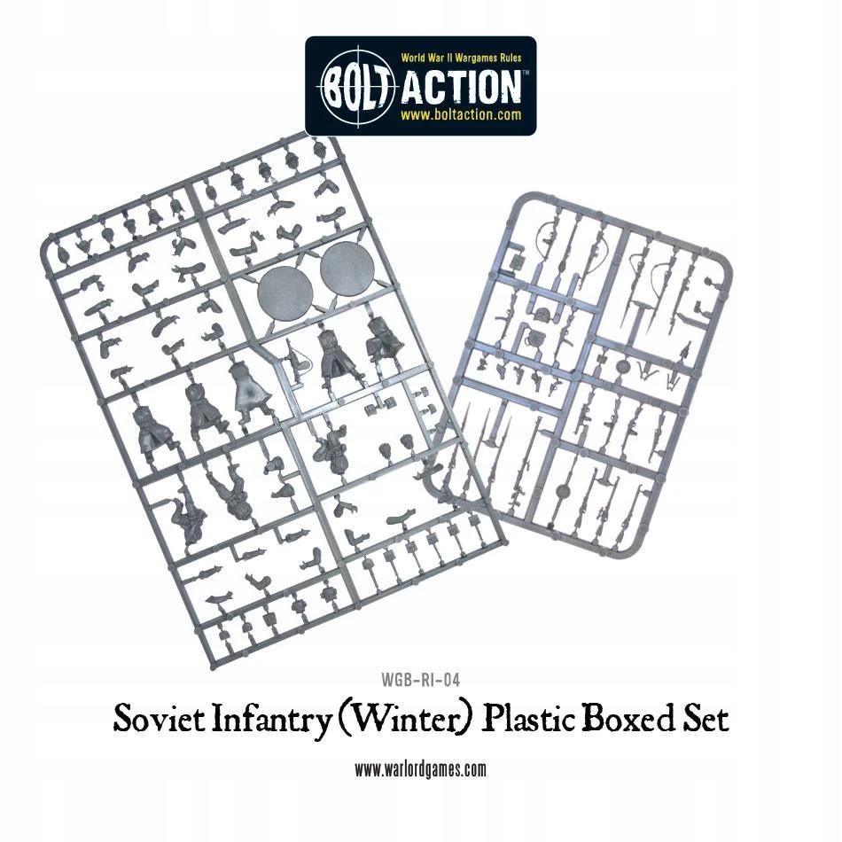 - Достаточно пластиковых элементов, чтобы сделать 40 миниатюр пехоты Советского Союза, оборудованные для борьбы в суровую зиму на восточном фронте. Содержит множество вариантов, позволяющих различным моделям оружия и команд.