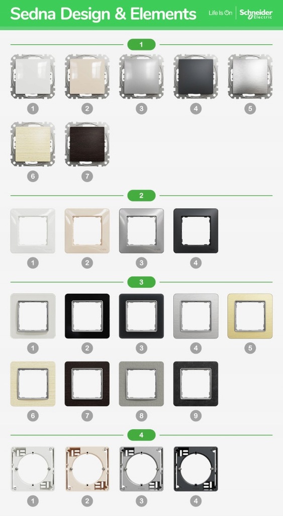 Оба механизма sedna design и sedna -элементы совместимы со всеми кадрами этих серий. Это позволяет вам создавать целых 91 различные цветовые комбинации, благодаря которой вы сопоставляете продукт, чтобы организовать ваш интерьер.
