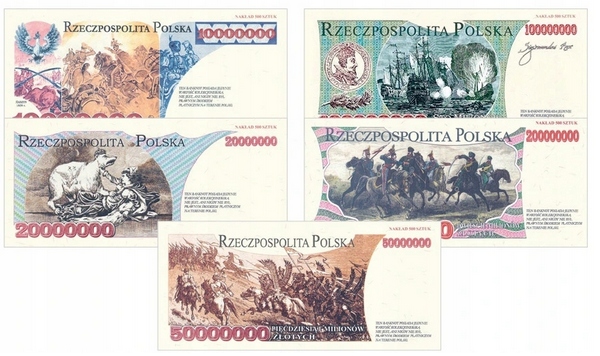 Набор состоит из копий дизайнов банкнот: 10 20 50 100 200 миллионов злотых - дизайны банкнот, продолжение серии банкнот Польской Народной Республики, до деноминации, удовольствие для коллекционеров: