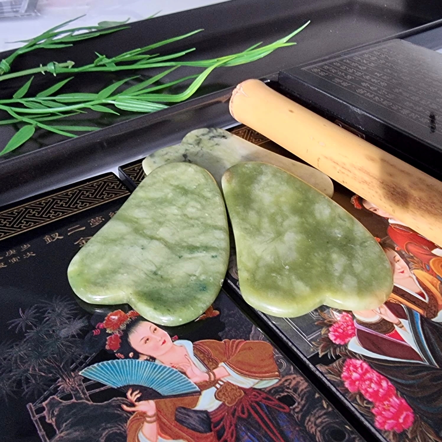 Массажер Гуа Ша представляет собой плоскую нефритовую пластину, используемую для традиционного массажа лица и шеи. Гуаша — древняя китайская техника лечения, используемая для улучшения лимфотока, укрепления мышц лица, разглаживания и уменьшения морщин.