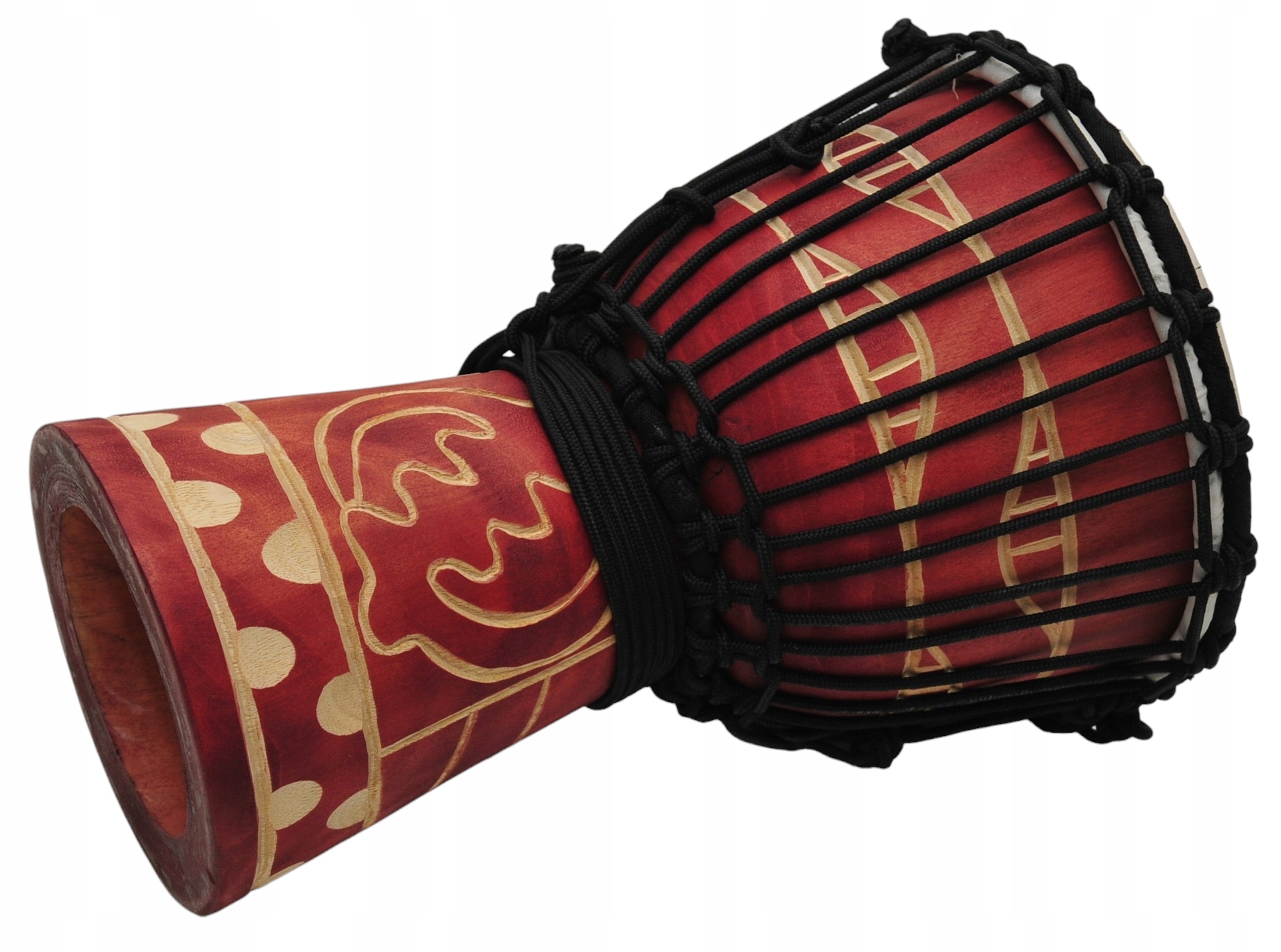 Корпус, сделанный из одного куска дерева красного дерева, мембрана из высокого качества натуральная кожа. ДЖЕМБЕ очень оригинальный, красочно украшенный красивыми этническими скульптурами. Оснащен удобной ручкой. Это делает его великолепным как ритмичный инструмент и красочный звук всей полосы.