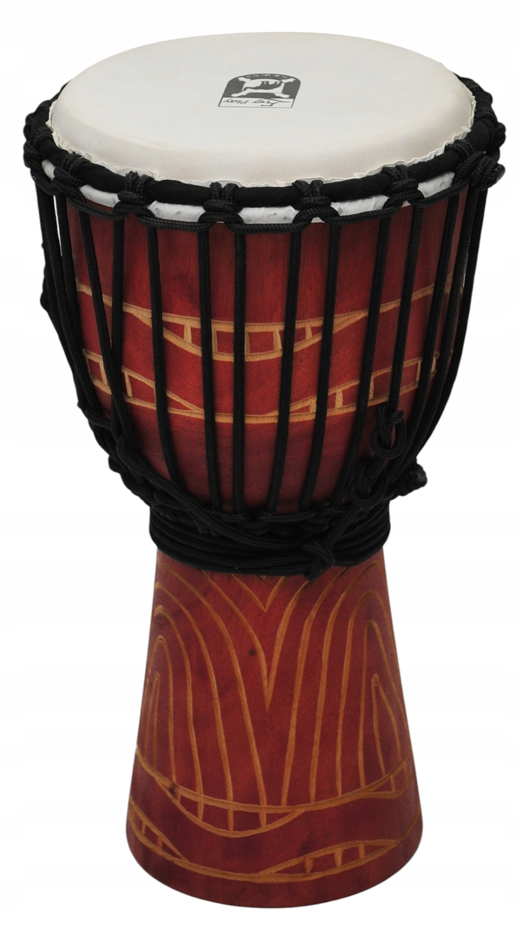 Корпус из одного куска дерева красного дерева, мембраны из высококачественной натуральной кожи. ДЖЕМБЕ очень оригинальный, красочно украшенный красивыми этническими скульптурами. Оснащен удобной ручкой.