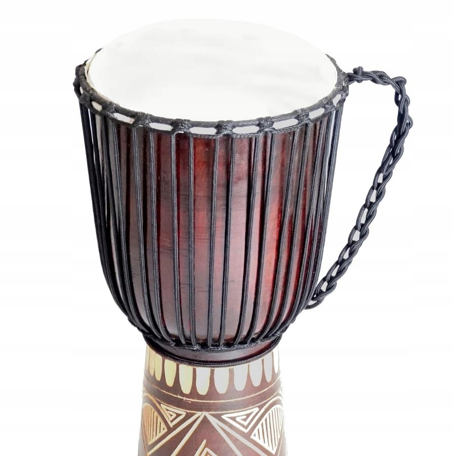 ДЖЕМБЕ (произносится джембе или джема), полученная из Африки, представляет собой единый инструмент, построенный на основе деревянной кружки. Источник звука представляет собой мембрану, чаще всего изготовленной из кожи козий или буйвола. Благодаря этому это дает теплый, естественный звук и легко переносит вибрации в тело. Его натяжение получено благодаря системе подтягивания кабелей, распространяющихся по всей чашке, и благодаря им, мы также тун, переплетая в нити между петлями правильно. Чем больше ширина мембраны и самой чашки, тем более громким и глубоким басом мы получаем. Итак, давайте подумаем, прежде чем покупать, если мы ищем более агрессивный, яркий звук или мы заботимся о более этнической, гроховой тонне. Стровая пальцами на краю, мы получаем высокий снимок, который должен подражать звуку ловушки- детерминанта импульса и ударить бас с открытой рукой посередине. Игра включает в себя умело переплетать эти два звука в правом ритме. Мы держим Джамбе между ногами, стоящими или сидящими, однако помните, что он слегка склонен, так что выпуск воздуха из тела не заблокирована, потому что мы не получим полный бас ...