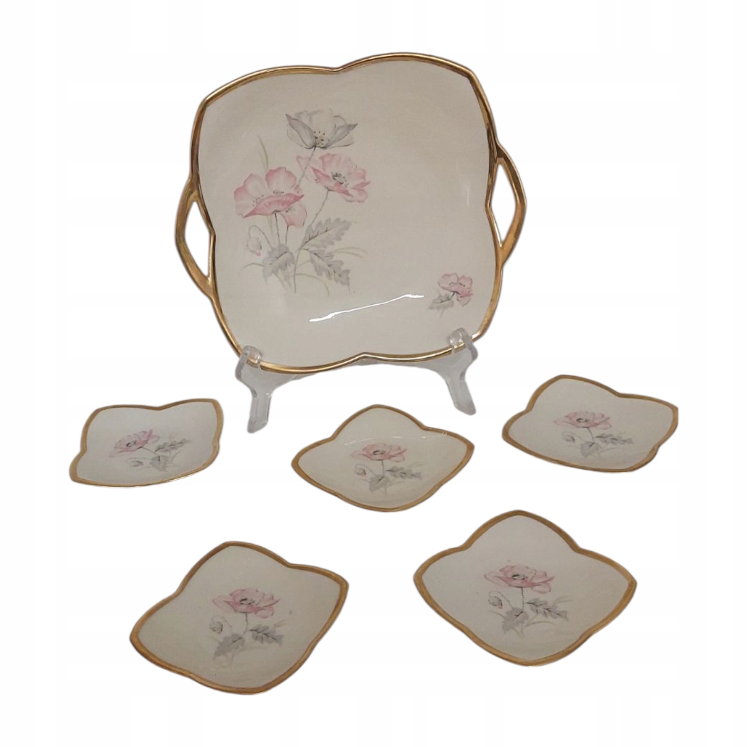 Размеры тарелки: высота 3 см, длина 20 см, ширина 17,5 см. Пять баночек для варенья диаметром 10 см.