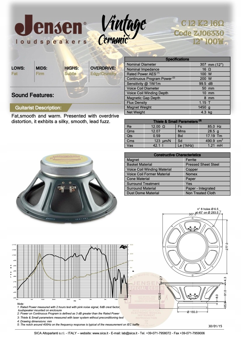 динамик Jensen C12K2 характеризуется простым и легким звуком, идеально реагирующим на перегрузку. Отношение к C12K. Он имеет другую мембрану, которая обеспечивает более растянутую реакцию высоких тонов для увеличения деталей и великолепия звука, сохраняя при этом хорошо сбалансированную мягкость. C12K-2 хорошо работает как с чистыми, так и со средними армированными звуками хруста, предлагая отличную реакцию на акцент. Когда он используется с более высоким подкреплением, он предлагает мощный, чистый, органический звук, который обеспечивает полную структуру с отдельными нотами.
