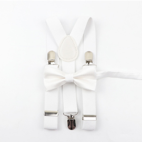 - регулируются по длине, что позволяет подогнать их под рост ребенка.Комплект из подтяжек и галстука-бабочки для ребенка белого цвета.