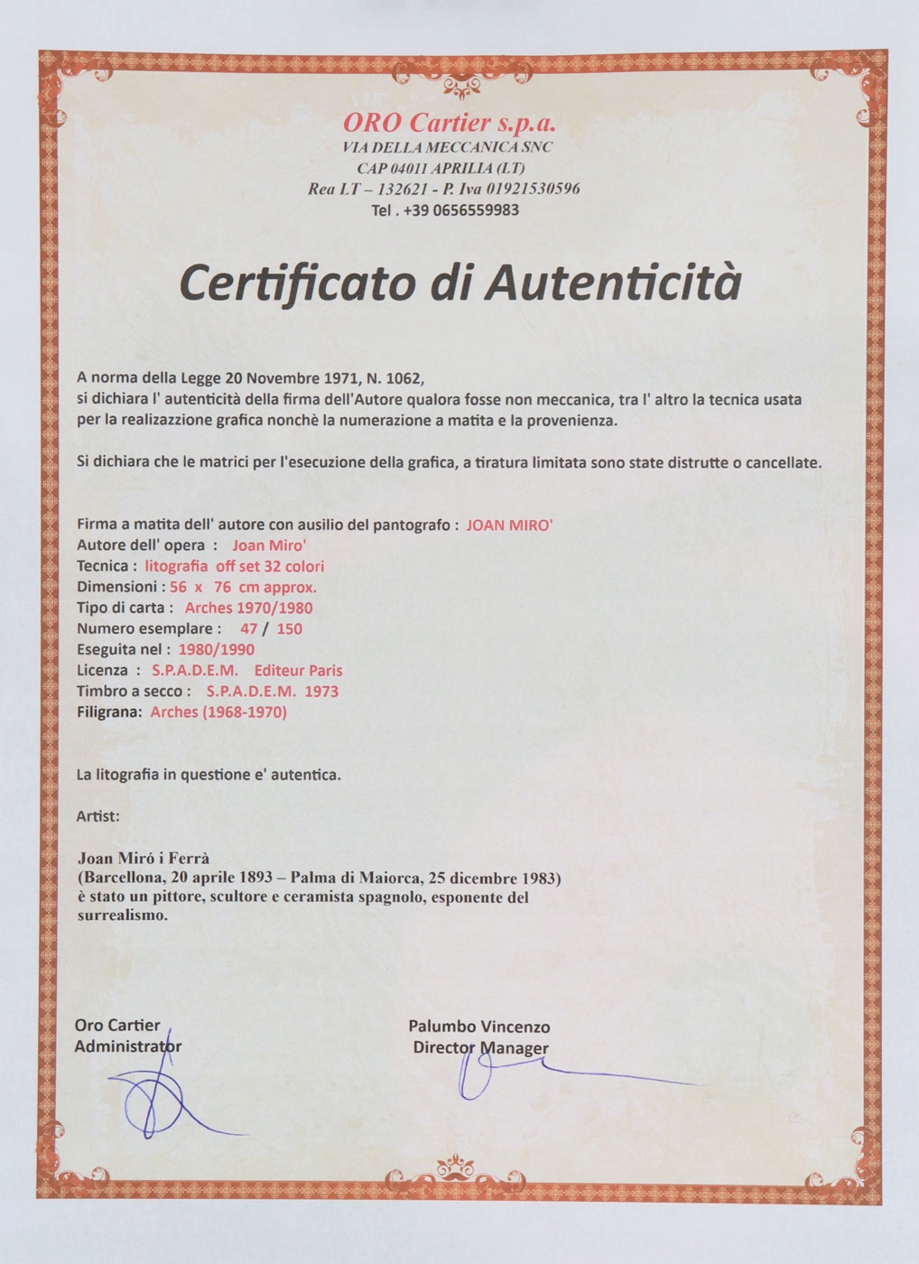 Графика с изображением композиция в порядке, характерной для работы автора. de Mallorca) - каталонский художник, скульптор и керамика. Его работы интерпретируются как принадлежащие сюрреализму как выражение возвращения в детство и как «песочницы для подсознания». Первоначально, под влиянием произведений В. фон Гога и Фовистов, он нарисовал портреты и ландшафты. В 1919 году он был в Париже, где он нарисовал кубистские натюрморты и пейзажи. С 1924 года он был связан с дадаистским движением, а затем с сюрреализмом. На его работу повлияли картины П. Кли. Индивидуальный стиль художника, стоящий на границе сюрреализма и романтической абстракции, наполнен атмосферой поэтической метаморфозы и фантазии. Он работал с символическими признаками, характеризующимися чистым, насыщенным цветом. В дополнение к рисованию изображений, он также имел дело с живописью, керамикой, графикой и скульптурой. , Нижний угол композиции, пронумерованный карандаш в нижнем левом углу 47/150 Поведение: очень хорошо