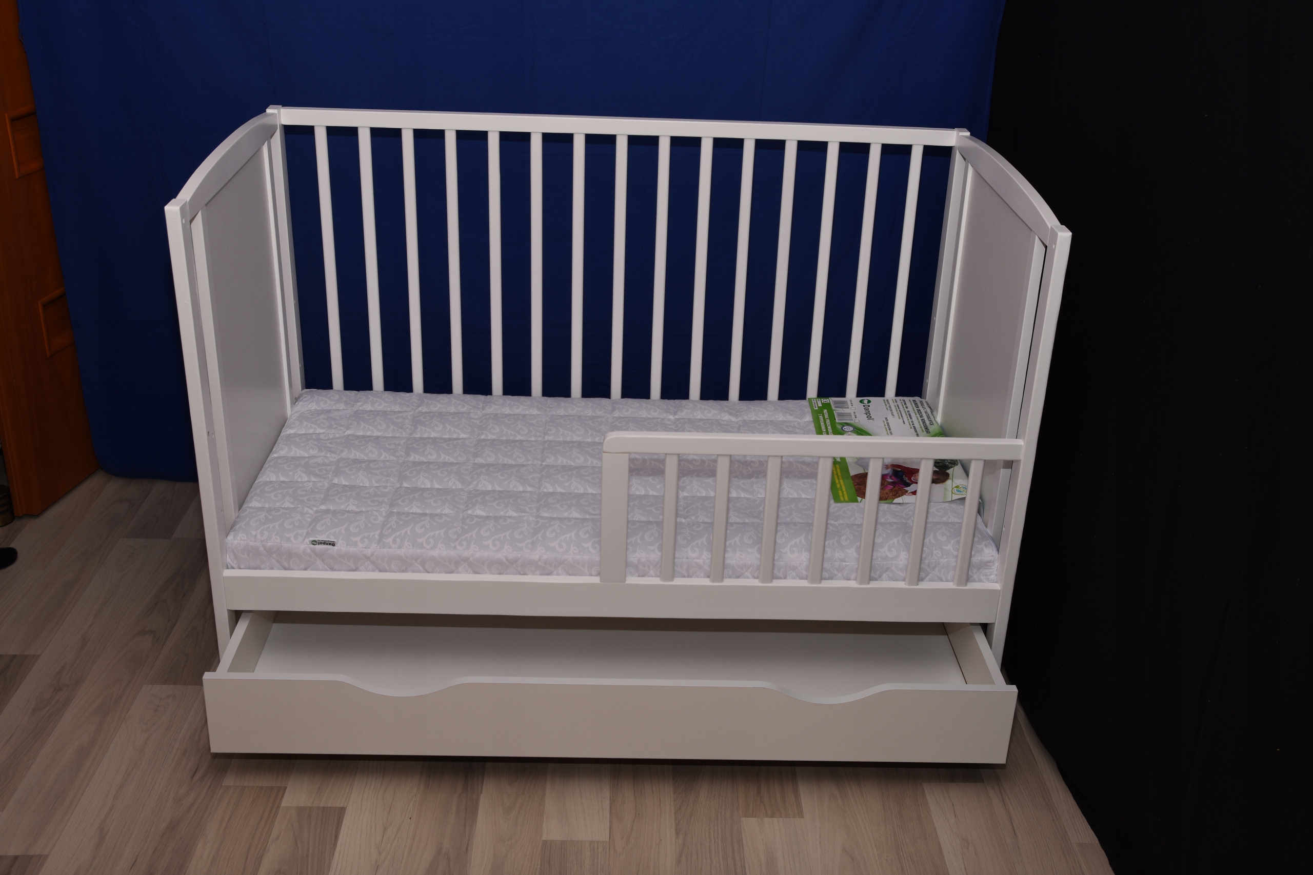 p>Детская кроватка изготовлена из первоклассной древесины сосны, может быть преобразована в лежанку для ребенка старшего возраста путем удаления бортика и установки безопасной «лесенки» (лестница безопасности входит в комплект), покрыта нетоксичными сертифицированными красками. и лаки.