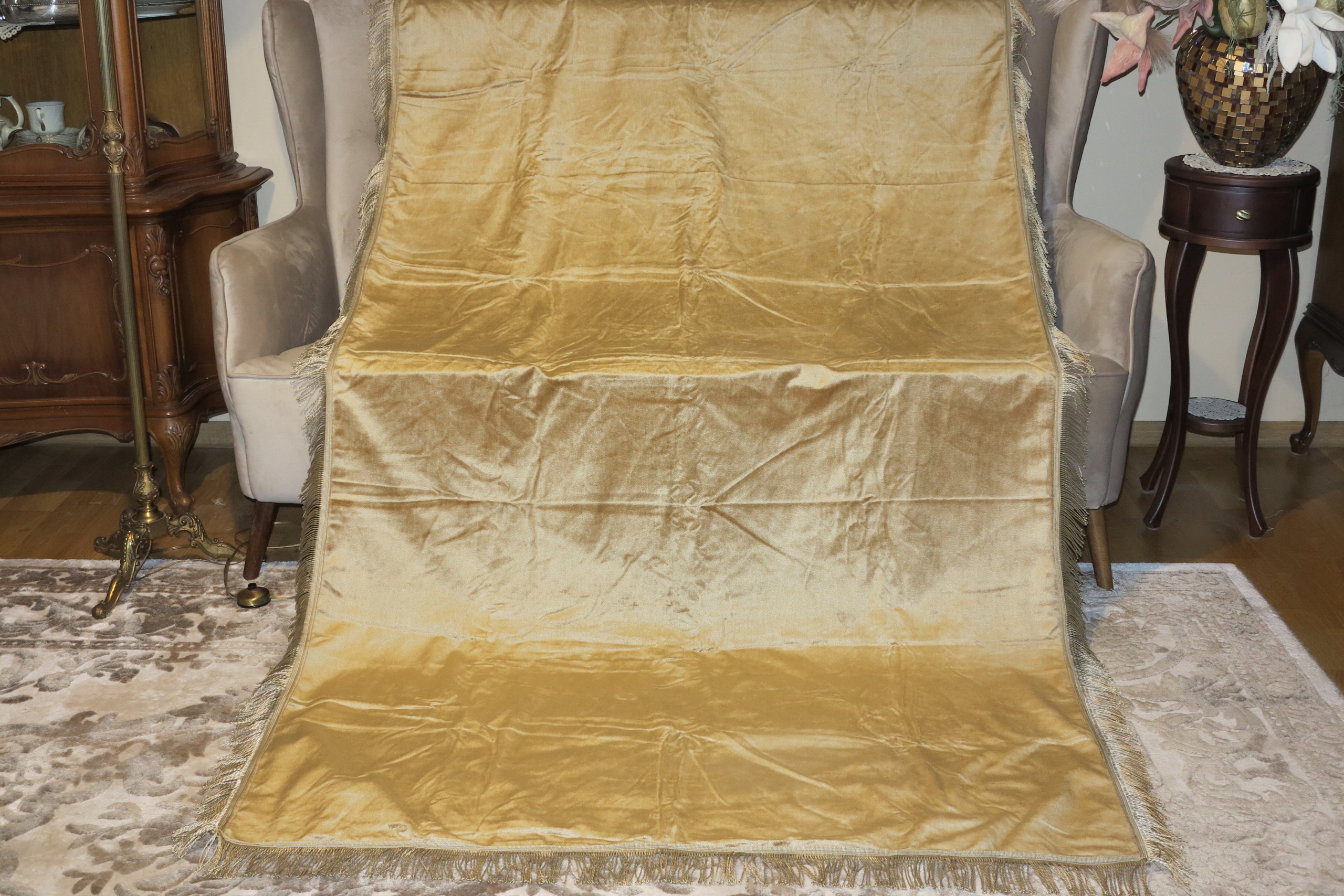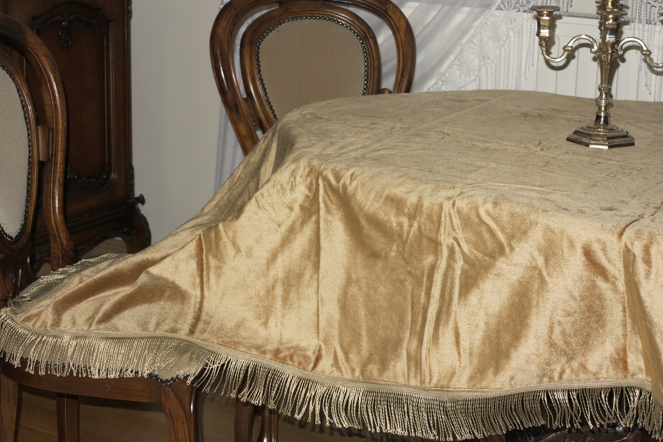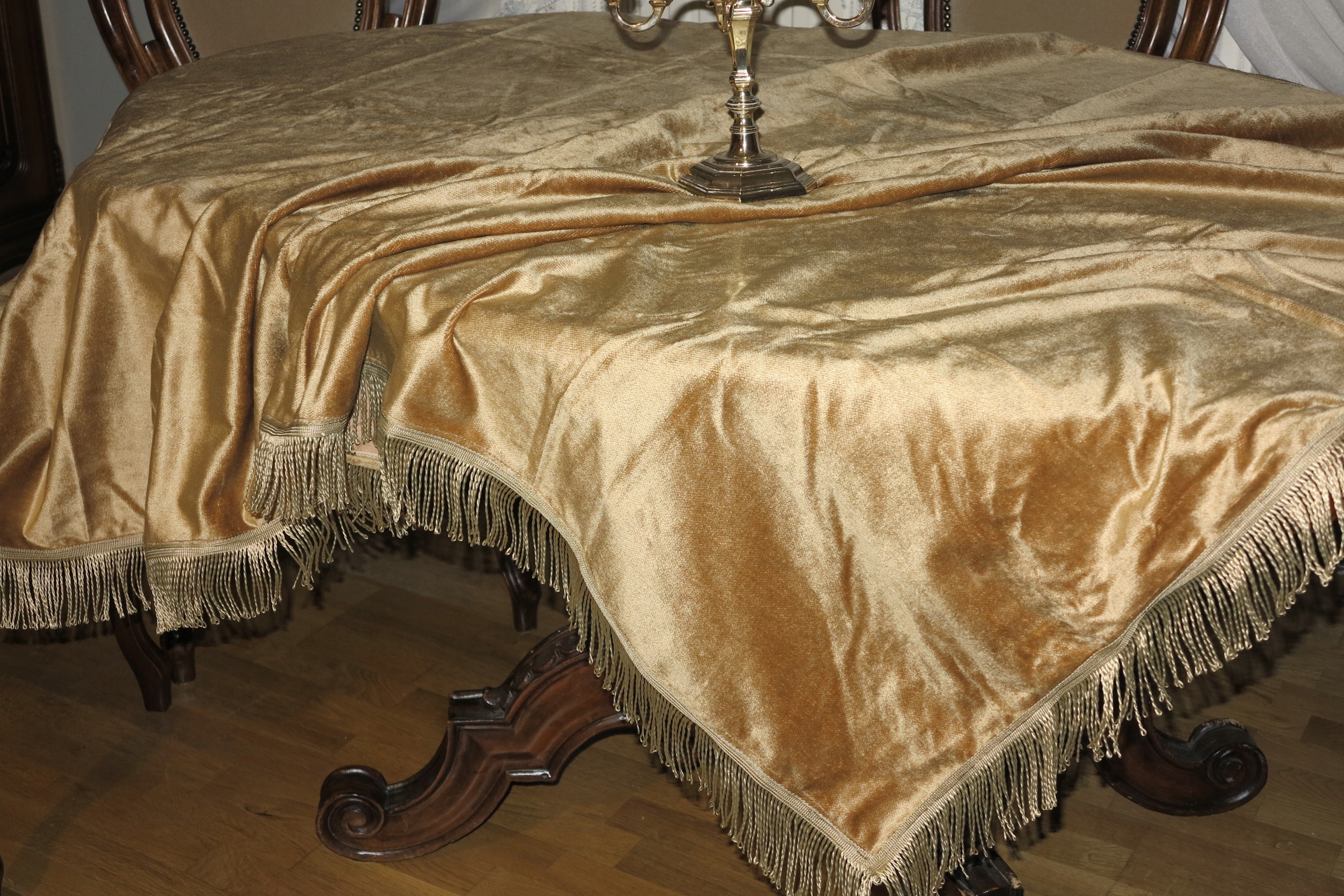 ДЛЯ АНТИКВАРИАТА - КРАСИВУЮ СТИЛЬНУЮ АНТИКВАРНУЮ СКАТЕРТЬ ИЗ БЛАГОРОДНОГО ПЛОТНОГО ХЛОПКА И ВЕЛЮРОВОГО БАРХАТА, ЗОЛОТОГО ЦВЕТА