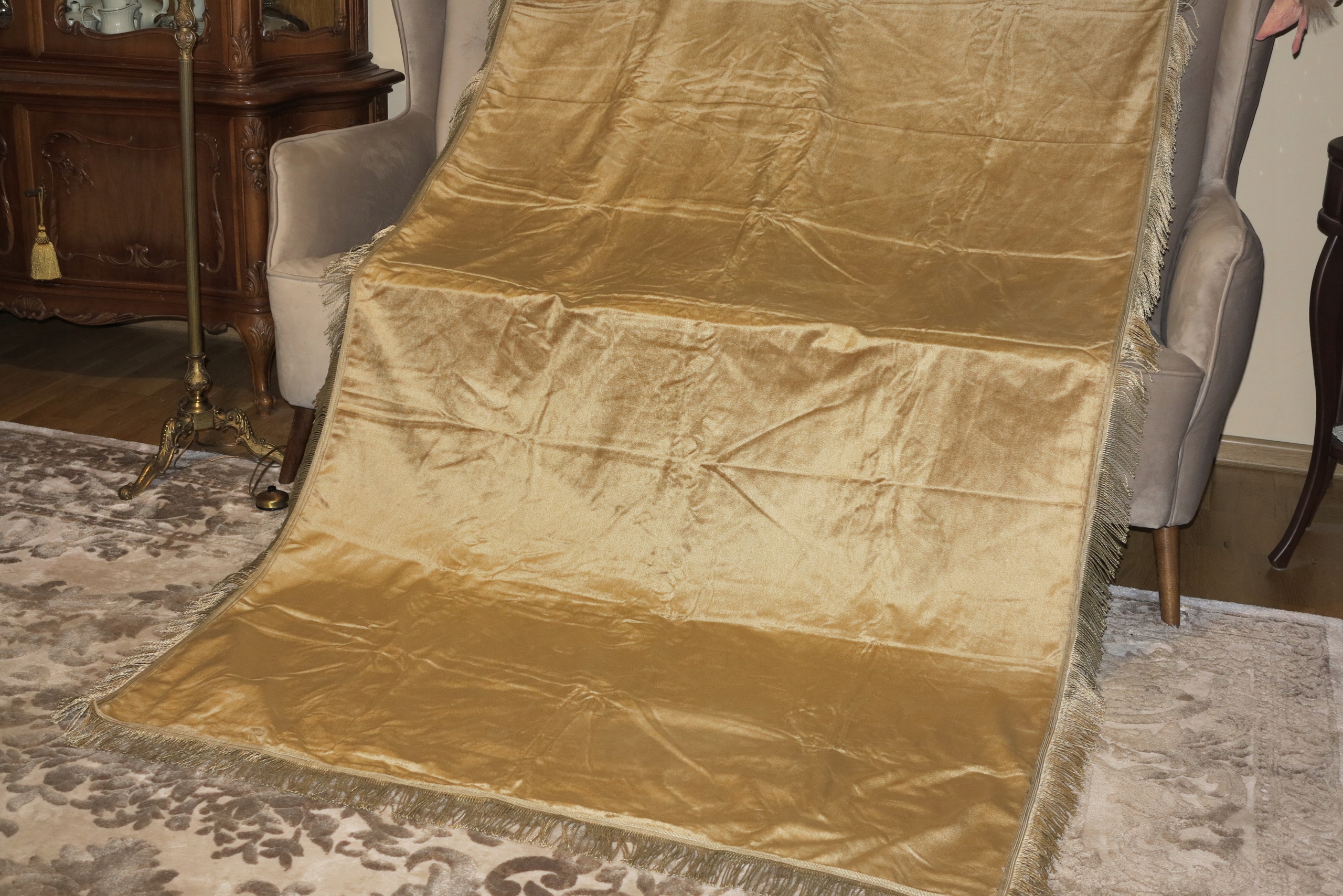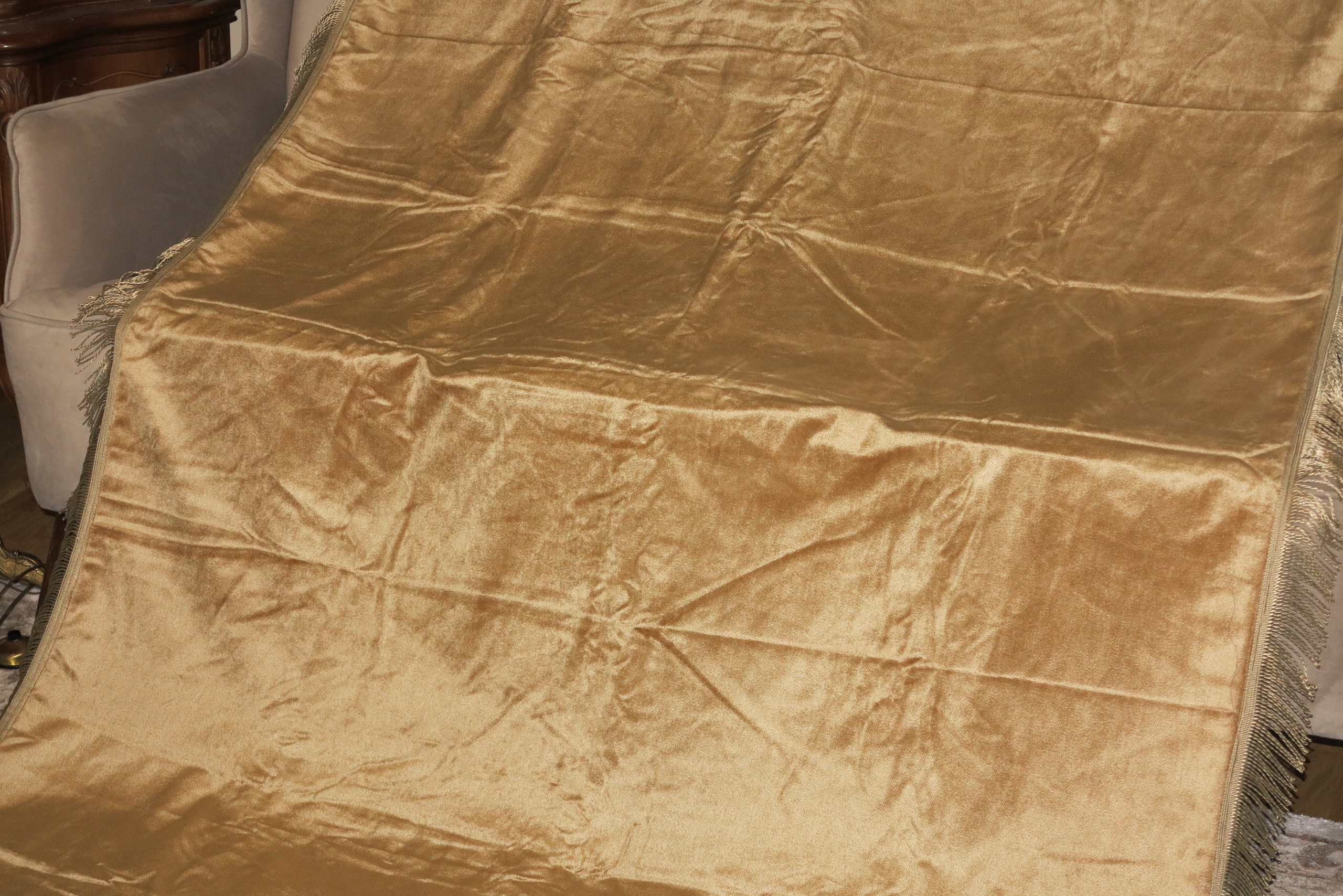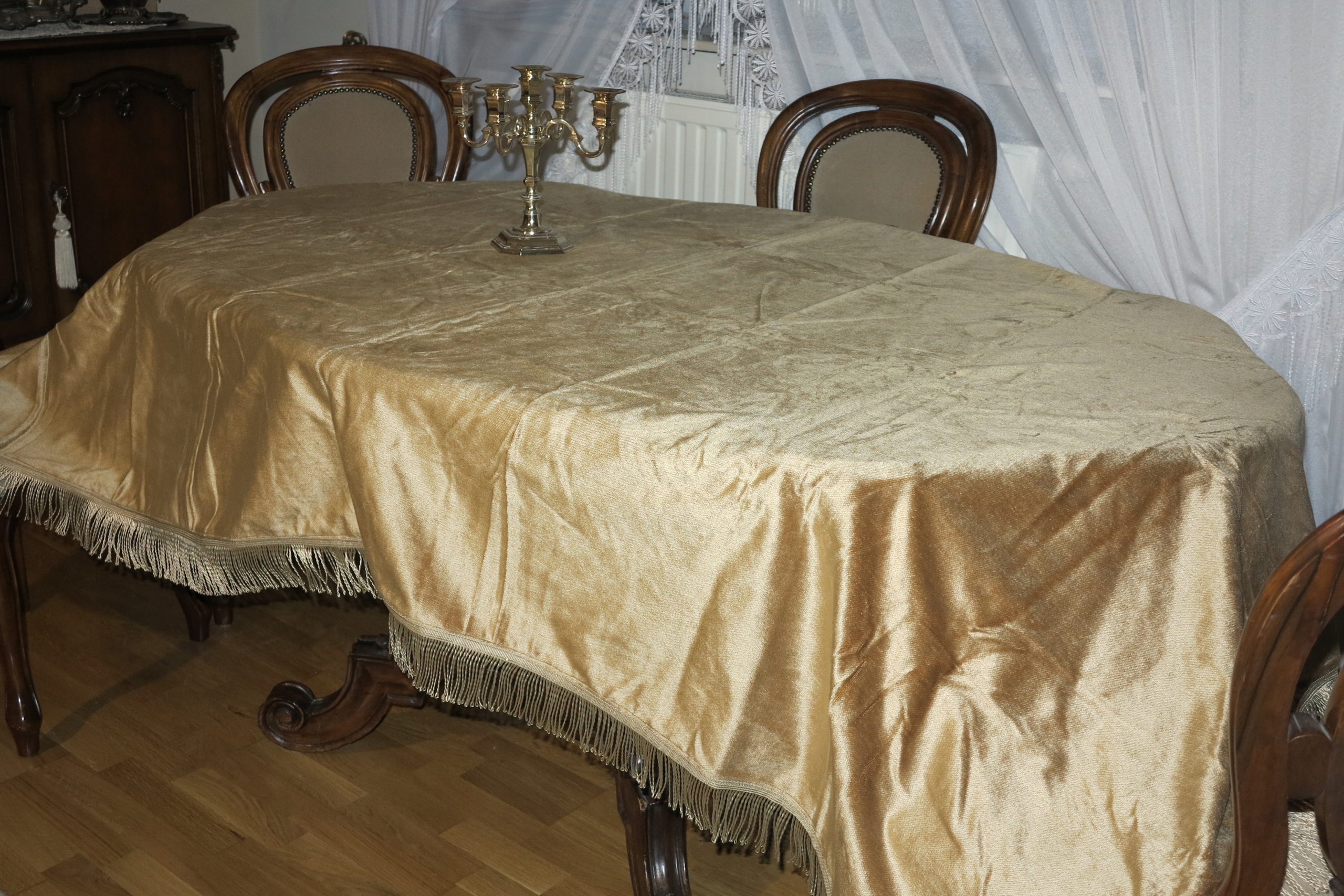 ДЛЯ АНТИКВАРИАТА - КРАСИВУЮ СТИЛЬНУЮ АНТИКВАРНУЮ СКАТЕРТЬ ИЗ БЛАГОРОДНОГО ПЛОТНОГО ХЛОПКА И ВЕЛЮРОВОГО БАРХАТА, ЗОЛОТОГО ЦВЕТА