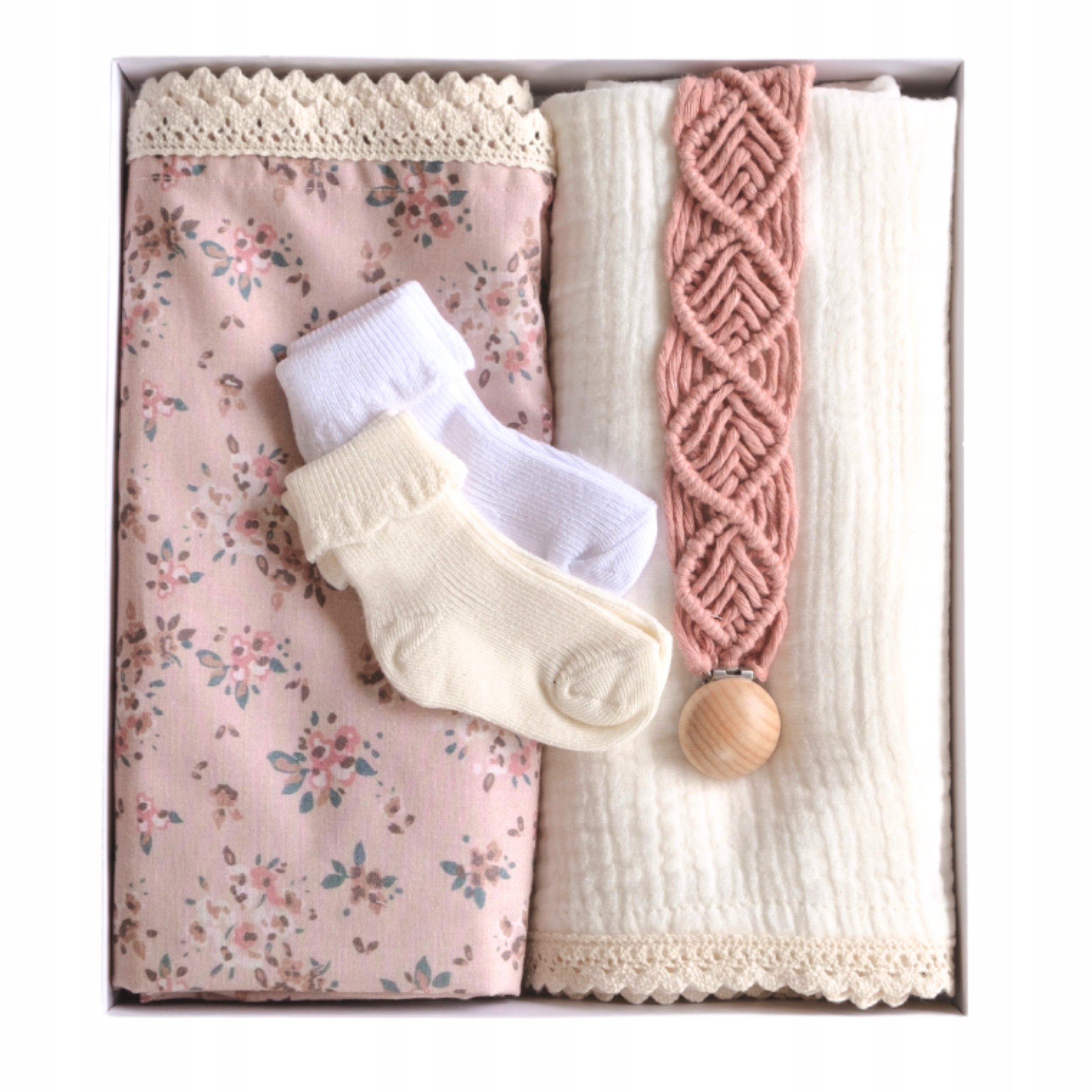- Хлопковые пеленки, носочки (0-3 месяца), кулон с зажимом для соски)