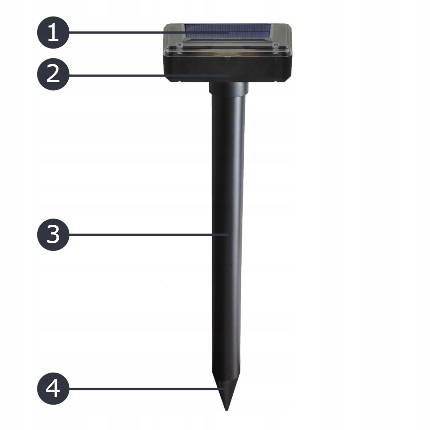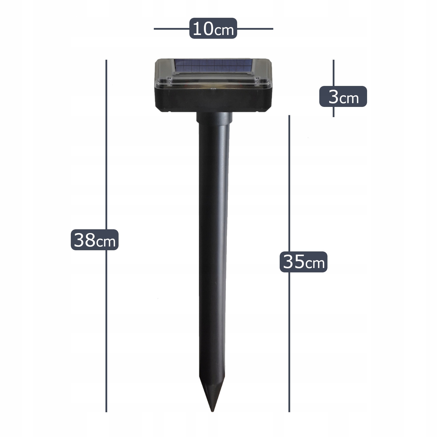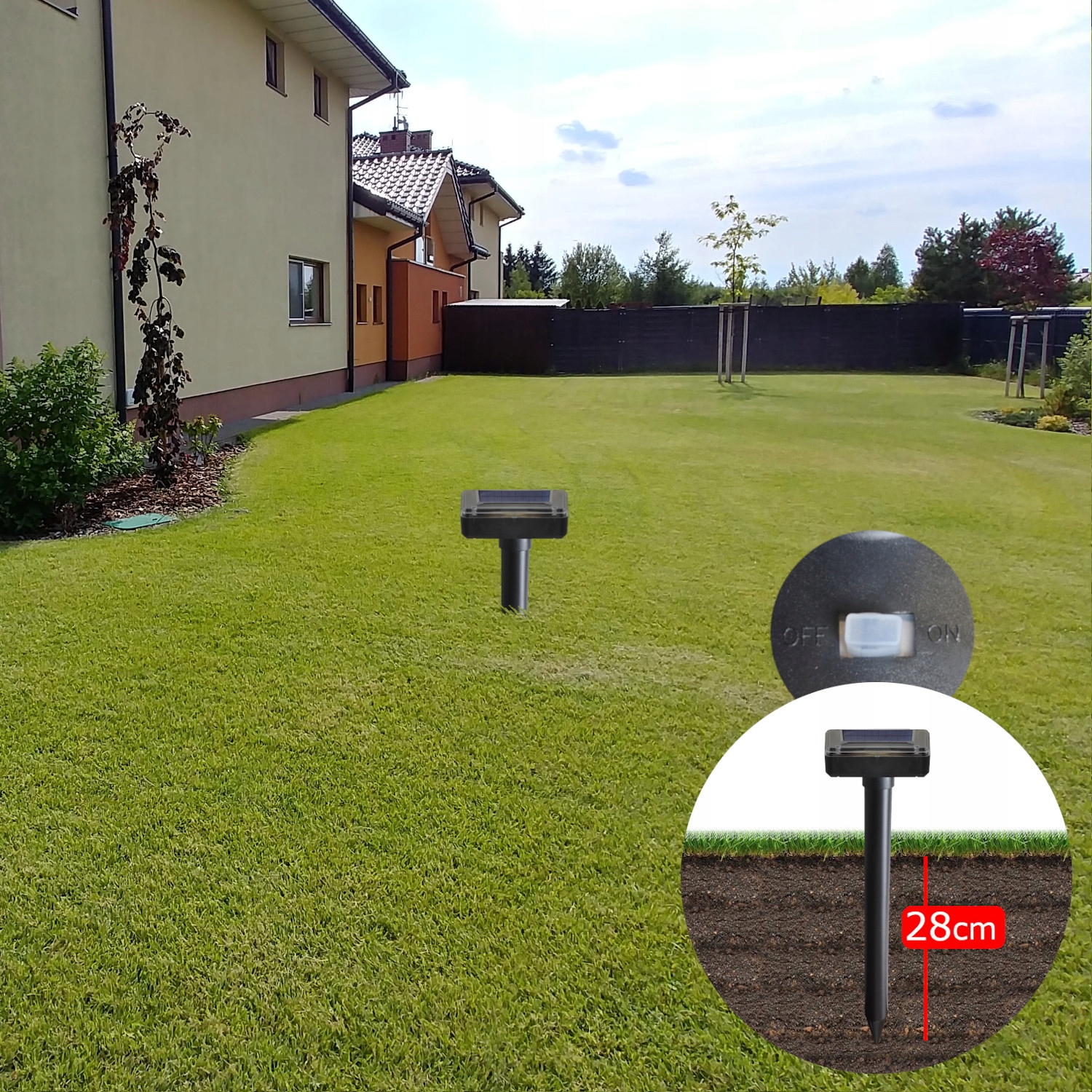 Благодаря специальному штифту с острым концом отпугиватель втыкается прямо в землю. Чтобы отпугиватель работал на полную мощность, штырь следует вставить в землю примерно на 32 см.
