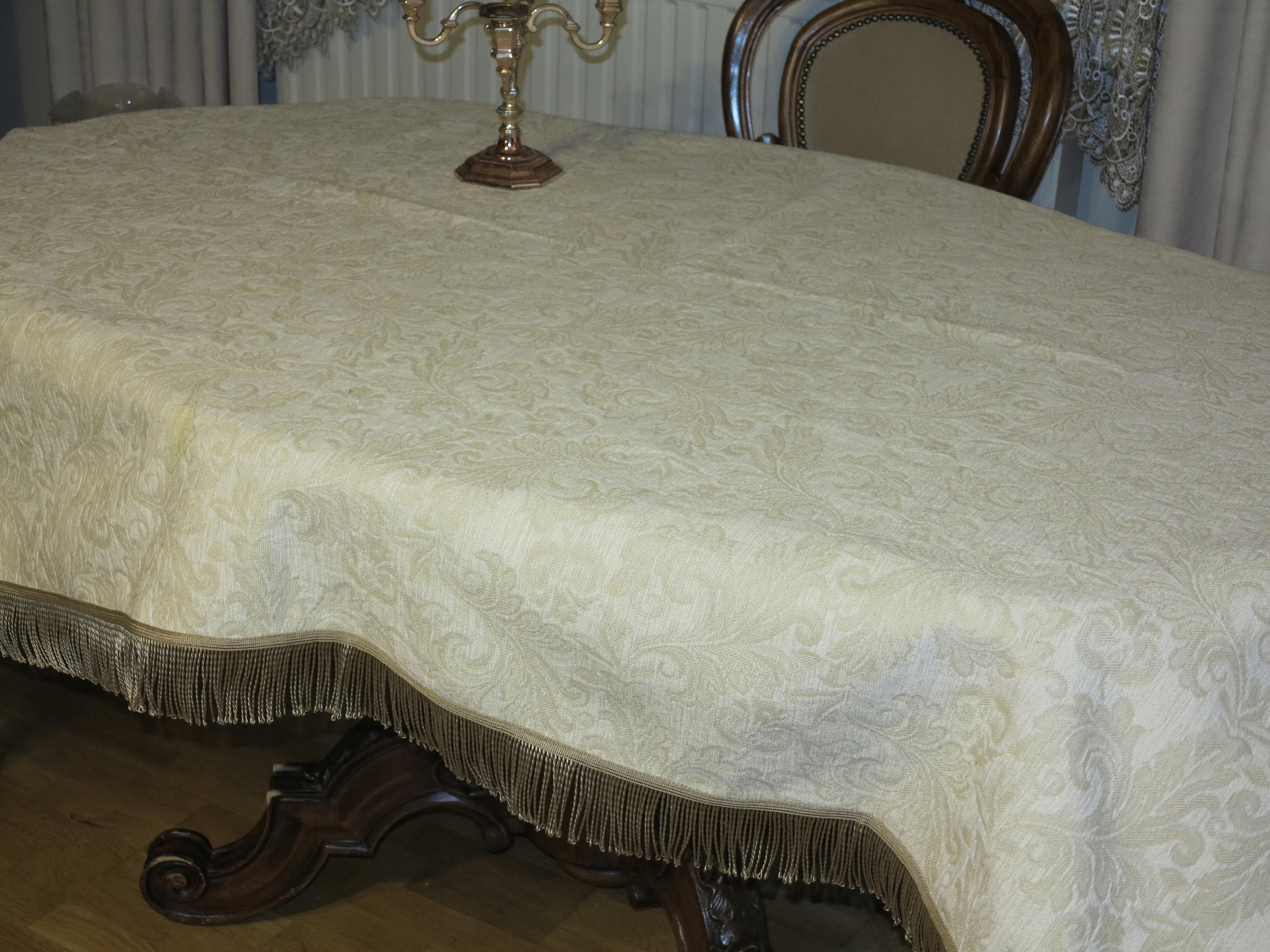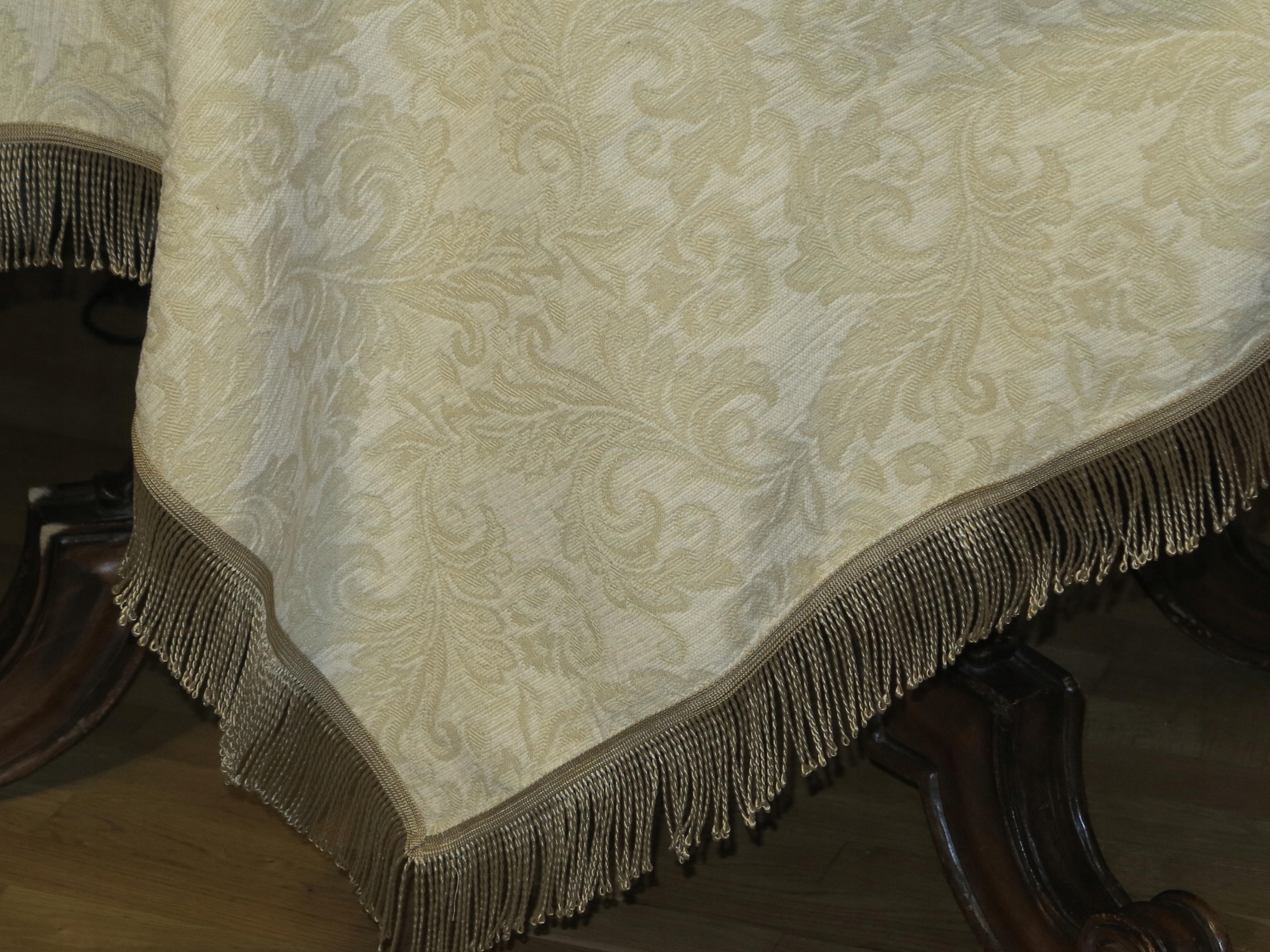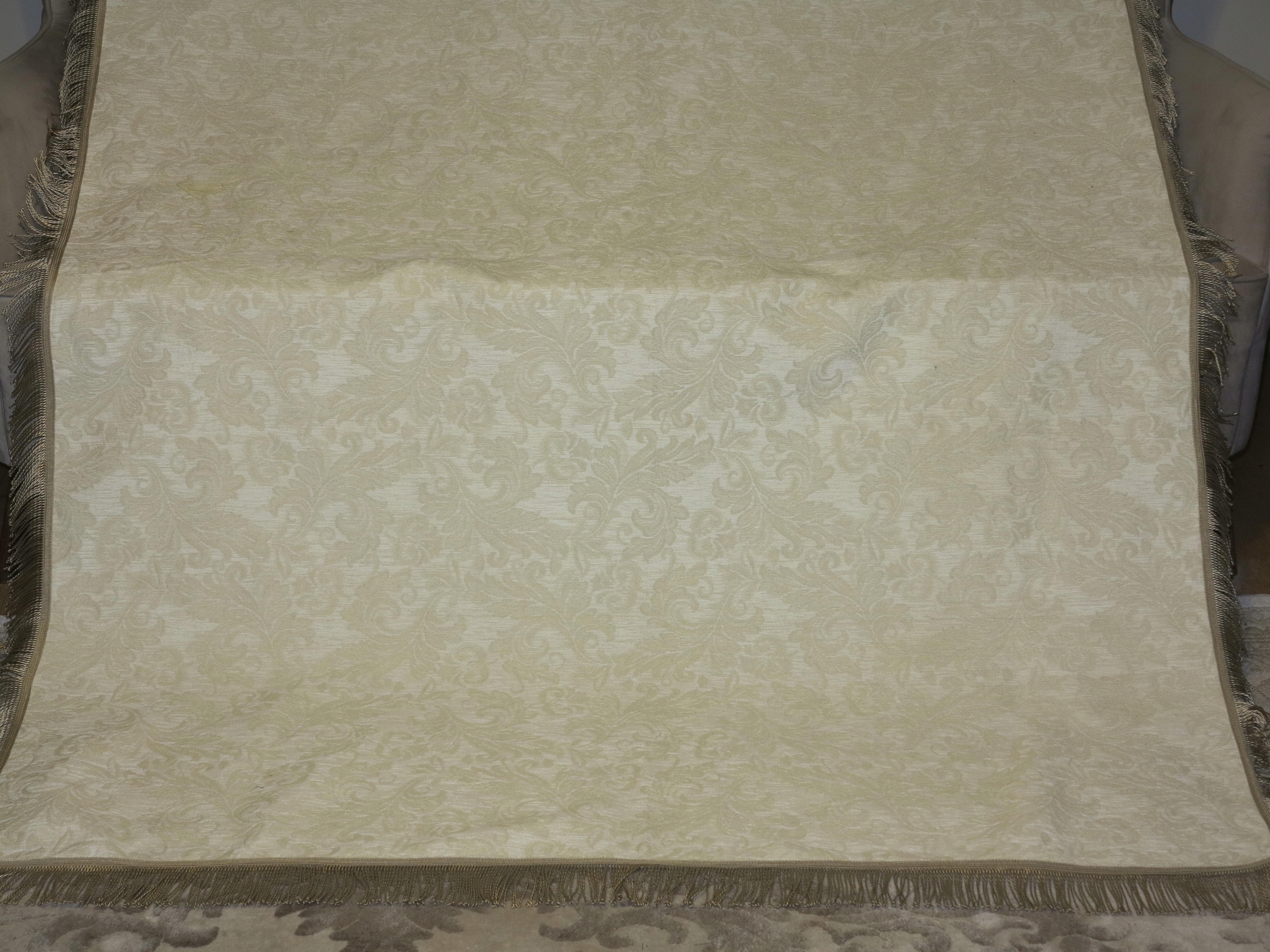 для знатока - чрезвычайно красивая скатерть из сплошного бархатного гобелена в Экру, в стильных золотых дизайнах. О том, что золотые полосы, законченные