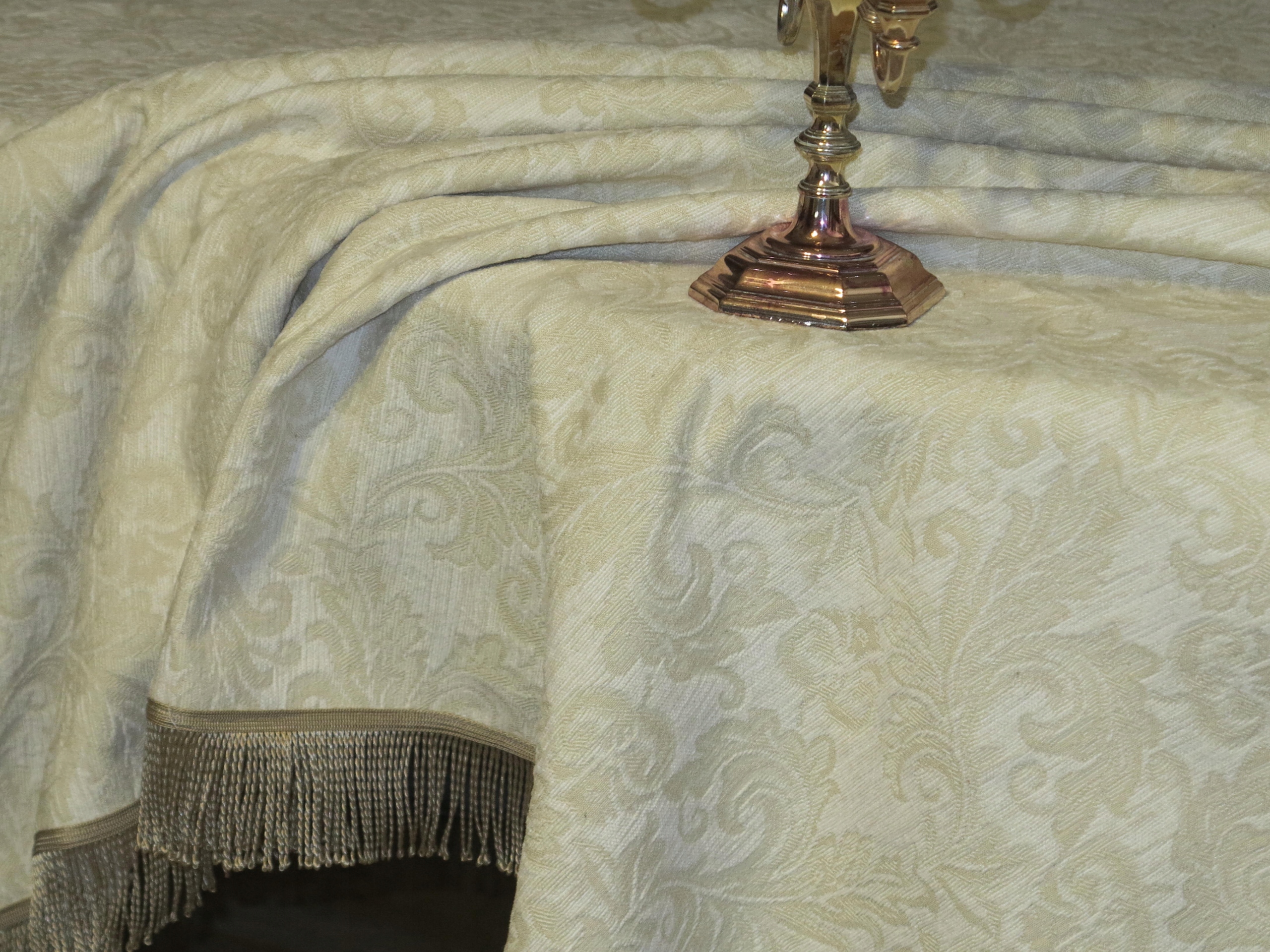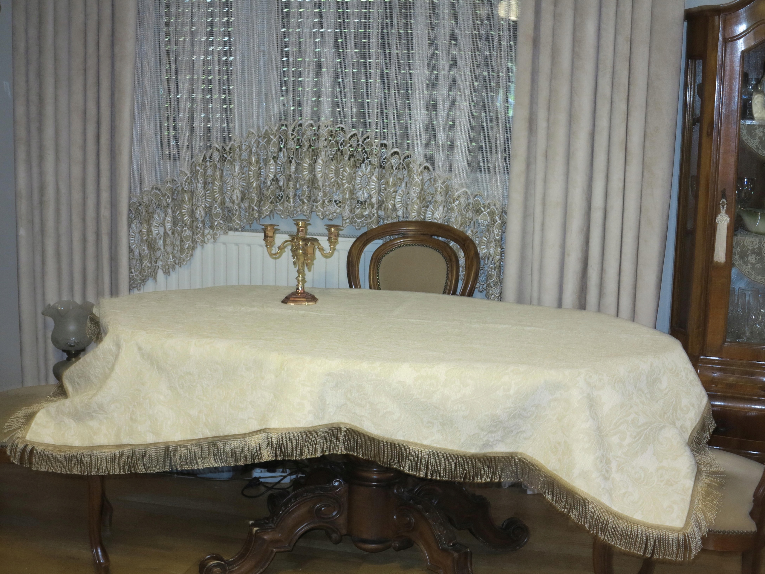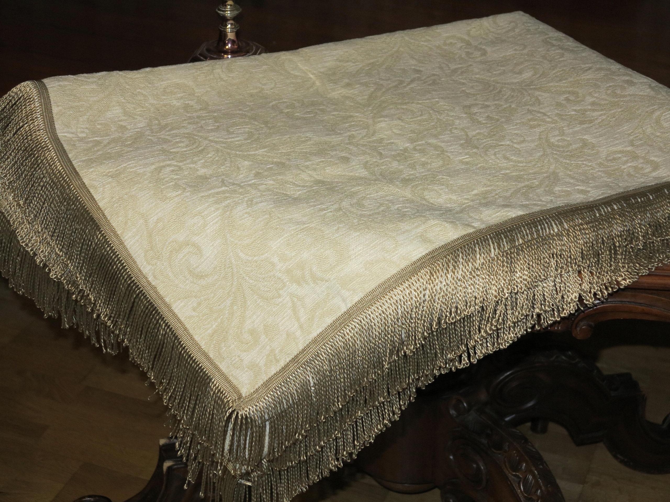 для знатока - чрезвычайно красивая скатерть из сплошного бархатного гобелена в Экру, в стильных золотых дизайнах. О том, что золотые полосы, законченные