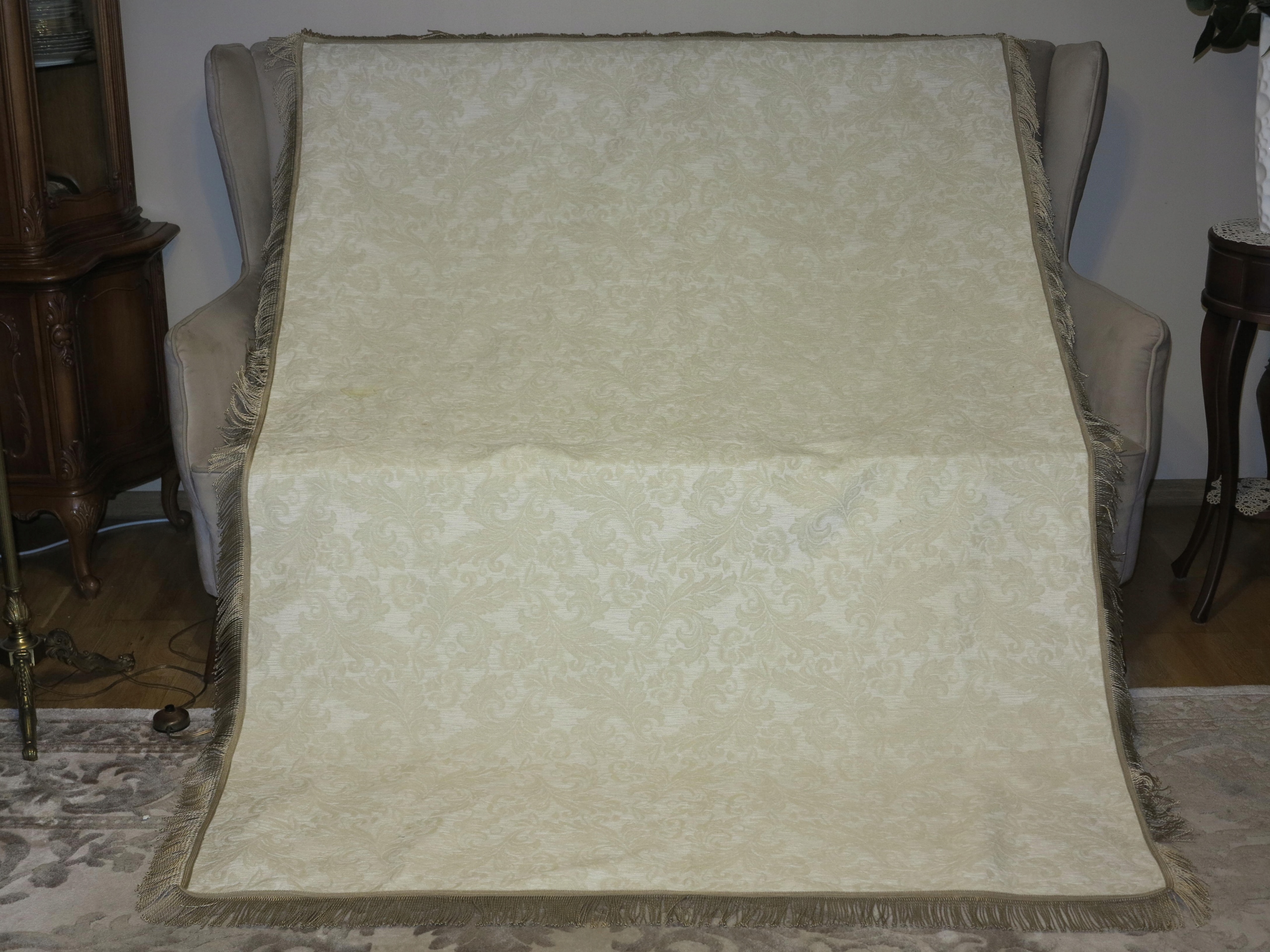 Объект аукциона - чрезвычайно красивая стильная, большая, гобелена, украшенная золотой полосами. Ставяная ласточка имеет размеры: 195/132 см плюс 7 см. Использовал скатерть, в супер хорошем состоянии и качество, несмотря на ваш возраст. Я рекомендую, отличное украшение стильного интерьера.