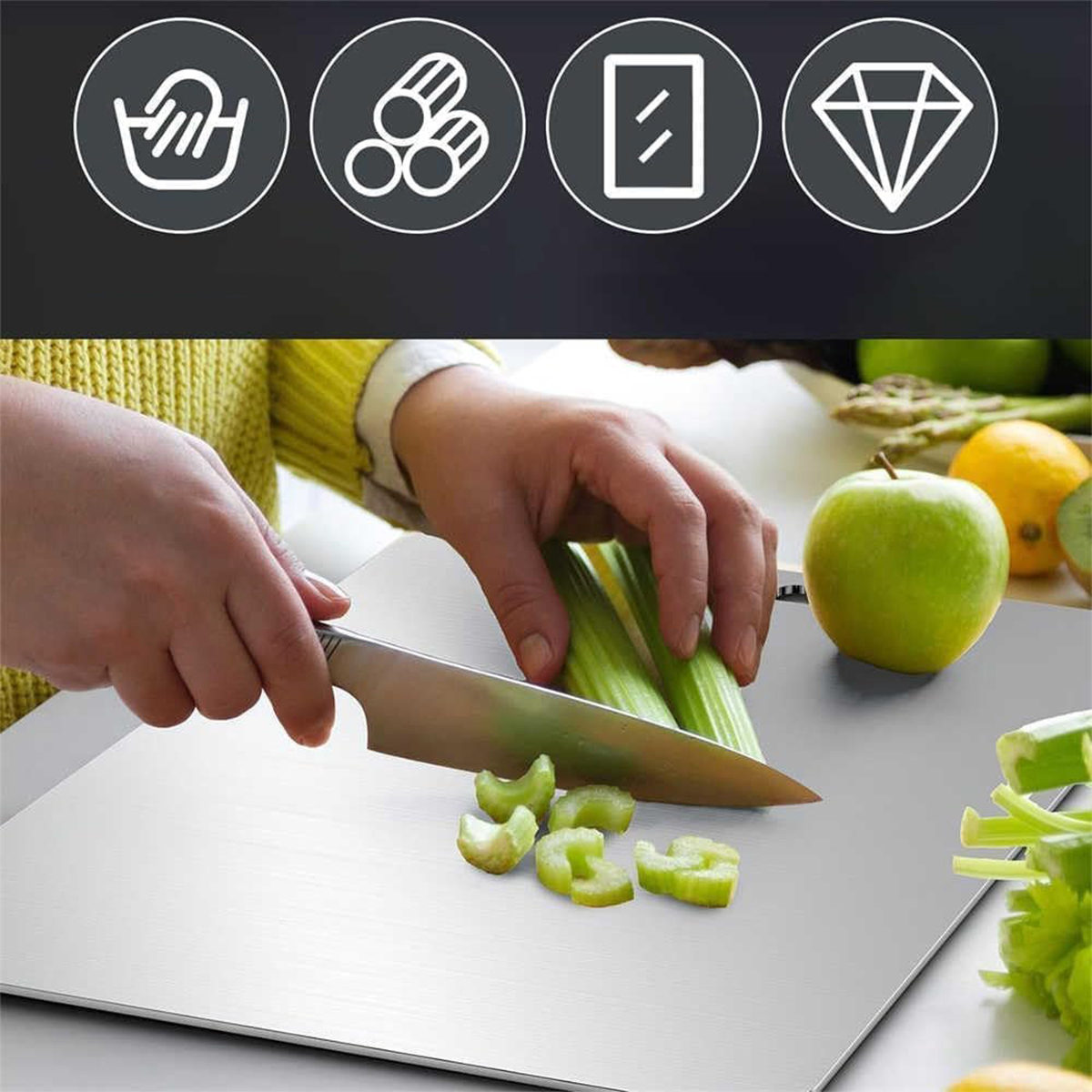 Эта доска из нержавеющей стали легко чистить. Еда или жидкости не придерживаются этого, просто промойте ее под проточной водой и немедленно высыхают, что позволяет вам использовать снова.