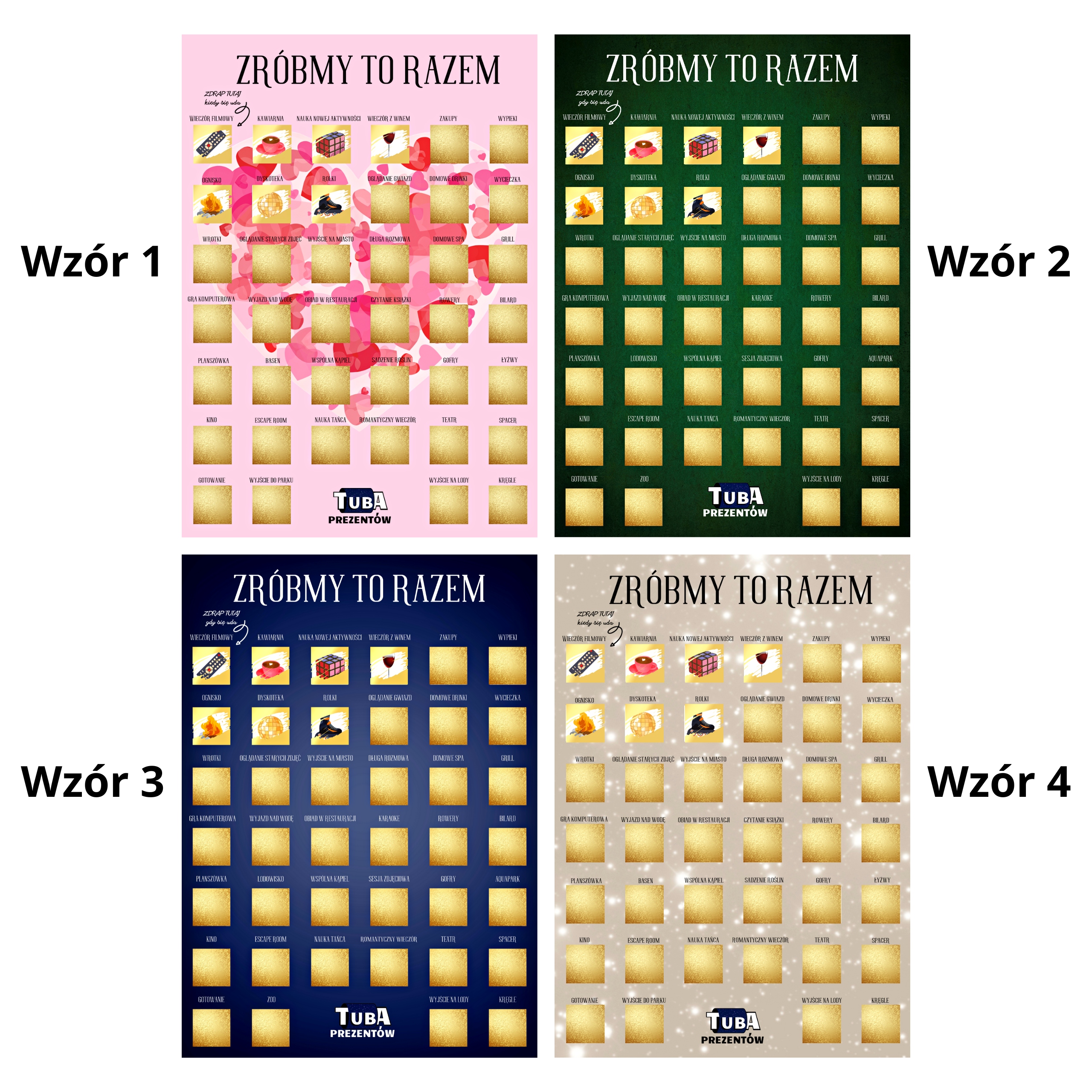 Плакат со скретч-картой — это глянцевый постер с персонализированными текстами или заданиями, которые нужно выполнить, спрятанными под золотой скретч-картой.