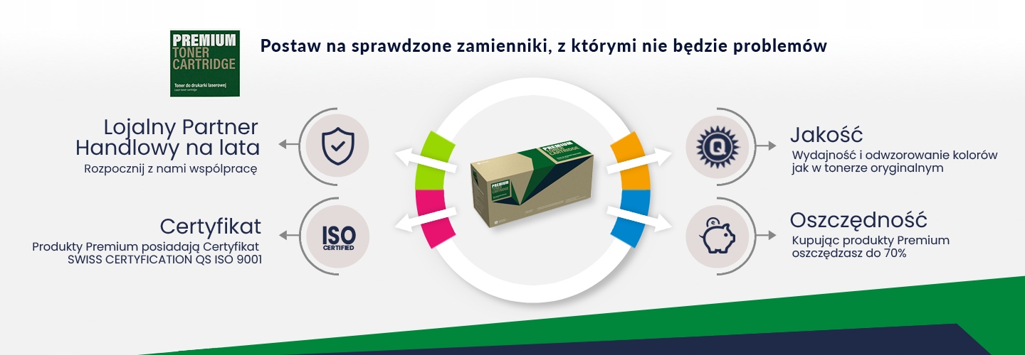 В тонерах бренда ПРЕМИУМ мы заменяем каждый элемент заново. Обработке подлежит только пустой пластиковый контейнер для порошка. Чип*, фотопроводник*, коллекторная полоса и т. д. новые. Благодаря этому их качество сравнимо с качеством оригинала. Тонеры бренда PREMIUM показали себя в ходе испытаний не хуже оригинальных тонеров известных производителей. Каждый тонер проверяется перед отправкой и упаковывается в защитные воздушные пакеты. Мы добились аналогичного ресурса печати страниц с оригинальным тонером, при этом цены на многие наши продукты в несколько раз ниже, чем на оригиналы. Качество подтверждено строгими сертификатами качества. ШВЕЙЦАРСКАЯ СЕРТИФИКАЦИЯ QS ZÜRICH AG - ISO 9001, ISO 14001.
