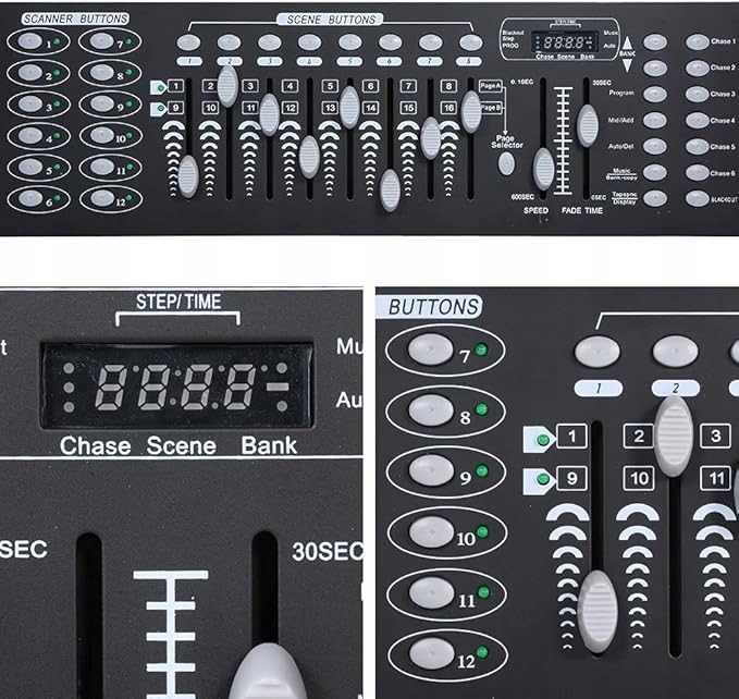 ★ Контроллер освещения DMX имеет 192 канала DMX и 12 сканеров по 16 каналов каждый. 30 банков по 8 программируемых сцен. 6 программируемых последовательностей, 240 сцен.
