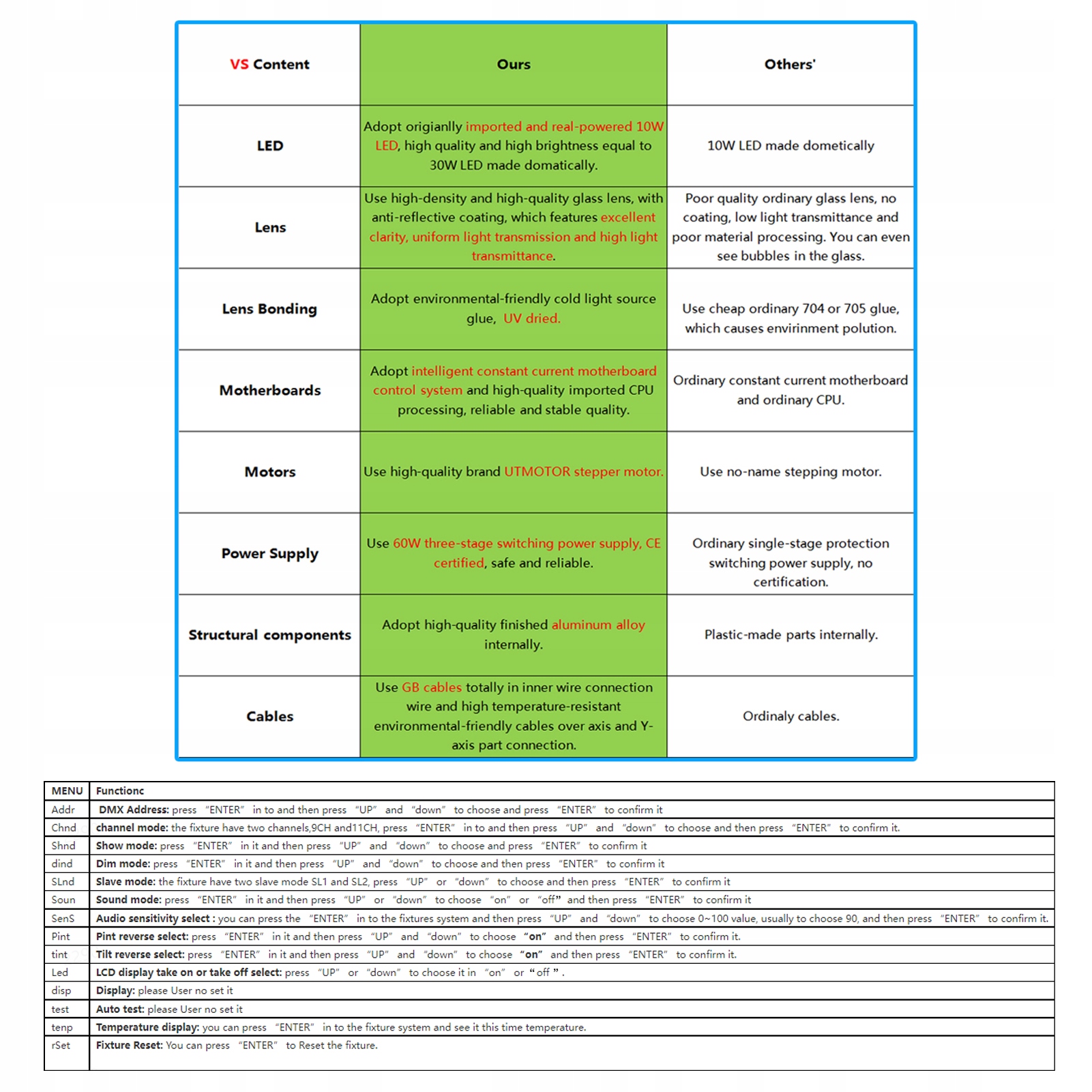 - Режим управления: DMX512, ведущий/ведомый, автономный стробоскоп, автоматический