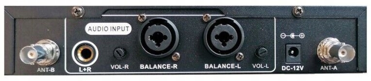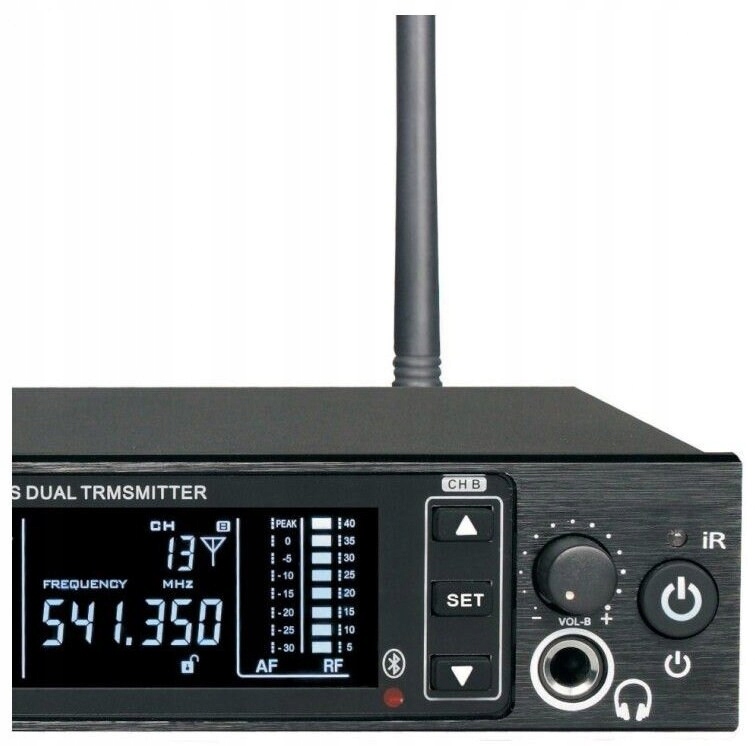 Вторая часть системы — передатчик радиоволн. с диапазоном частот от 518 до 542 МГц. На задней стороне корпуса расположены два совмещенных входа — XLR/Jack для левого (L) и правого (R) каналов с поворотными потенциометрами громкости, вход стерео jack (6,3 мм), гнездо для подключения блока питания (входит в комплект). )) и два антенных разъема BNC. На передней части расположены выключатель питания, два разъема для наушников с потенциометрами громкости и панель управления с кнопками «Вверх», «Вниз», «Установить» и четким ЖК-дисплеем. Здесь отображаются текущие параметры системы звукового мониторинга, такие как уровень качества сигнала, установленная настройка рабочей частоты и выбранный канал передачи данных.