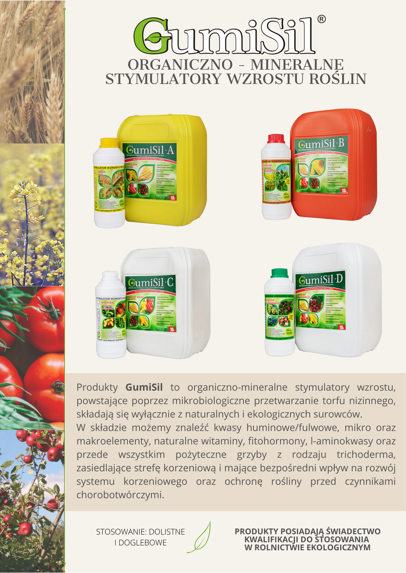 — органоминеральный стимулятор роста всех видов овощей, который создается путем микробиологической переработки низинного торфа, препарат состоит только из натурального и экологического сырья. . В состав входят гуминовые/фульвокислоты, микро- и макроэлементы, натуральные витамины, фитогормоны, L-аминокислоты и, прежде всего, полезные грибы триходермы, обитающие в прикорневой зоне и оказывающие непосредственное влияние на развитие корневой системы и защищающие растение против патогенных факторов. Стимулятор ГумиСил-С можно использовать как внекорневую, так и почвенную обработку. Препарат разрешен к использованию в органическом земледелии №. SE/15/2018.