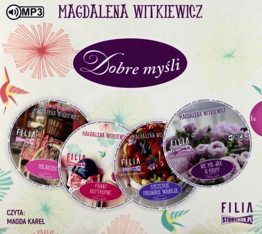 Мил, постоянно ищет любовь всей своей жизни, злющий Бахор растет в компании своеобразной собаки, Париж Антонио и Зофия Крук, эксцентричной пожилой леди, делает скуку, которое было навсегда удалено из книги словарь. Автор, как обычно, очаровательно, мудро и с юмором, рассказывает о женщинах и их перекрестке. О силе, которая лежит в них и о большой необходимости счастливого конца. Это дает своим читателям наиболее ценным: дружба, поддержка и надежда, что стоит поверить в хороший конец. Прочитав эти книги, вы захотите обнять всех, кого любите! Содержание упаковки: хорошие мысли. Том 1. Милачик - Время: 6 часов 5 мин-ISBN 978-83-8075-403-4 Хорошие мысли. Том 2. ПРЕДВИЖИЕ ДАМИ - Время: 6 часов 28 Мин-ISBN 978-83-8075-406-5 Хорошие мысли. Том 3. Ароматный с ванилью - Время: 6 часов 43 Min-ISBN 978-83-8075-409-6 Хорошие мысли. Том 4. Нет ничего похожего на мою маму - время: 6 часов 31 Min-ISBN 978-83-8075-410-2