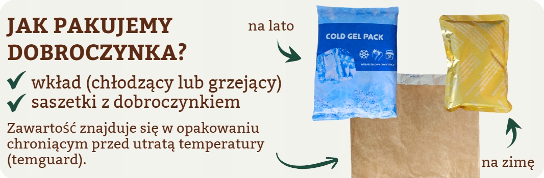 При транспортировке пакетики с доброчинеком надлежащим образом закреплены - зимой к упаковке добавляется нагревательная вставка, не имеющая прямого контакта с продуктом, а летом к упаковке добавляется охлаждающая вставка для обеспечить оптимальные условия и защиту от экстремальных температур.