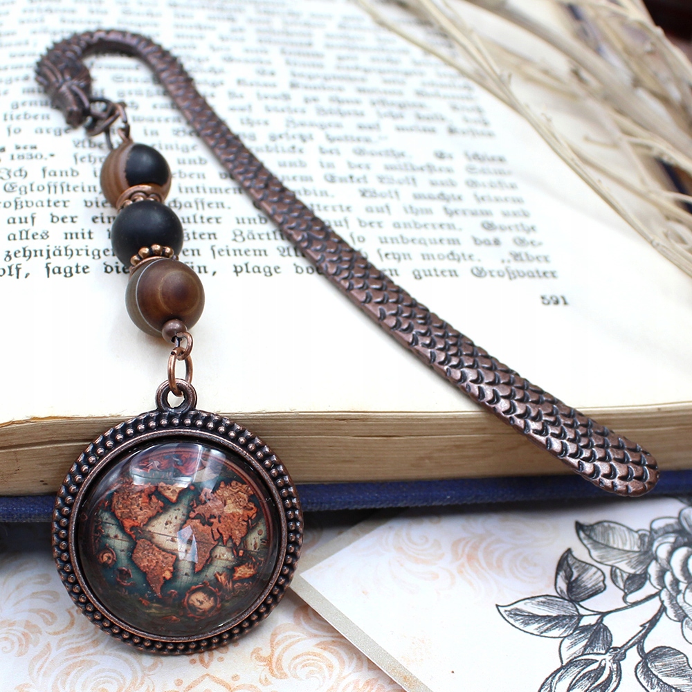 закладка с иллюстрацией, изображающей старую карту мира. Слайд, в рамках цвета окисленной меди. - 9,5 см B> Винтажный стиль b> относится к эстетике прошлого, подчеркивая элегантность и очарование старых времен. Это сработает, среди прочего По случаю дня учителя или дня рождения