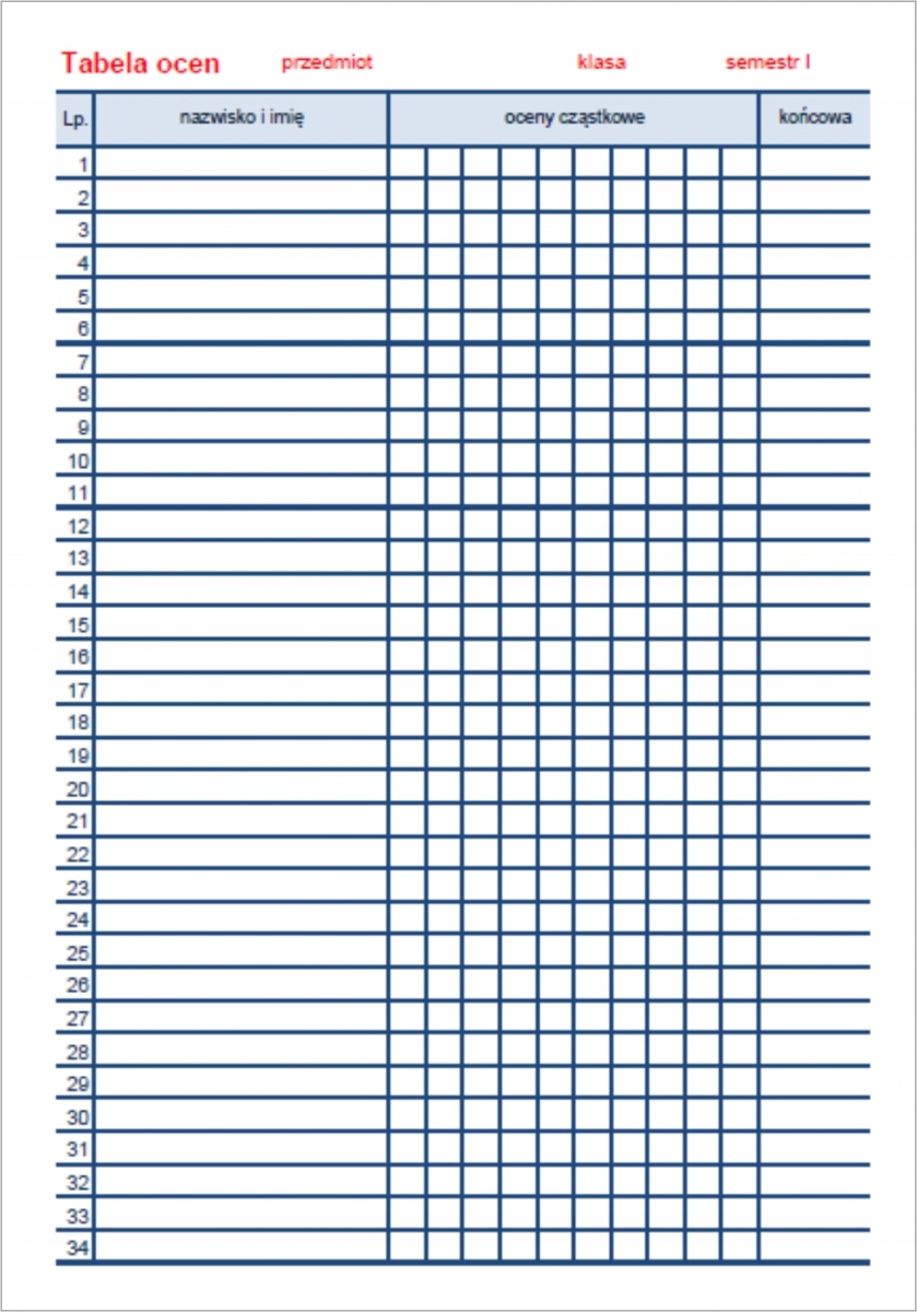 Одна таблица двусторонняя, охватывает 2 семестра, т.е. включает оценки учащихся одного класса за весь учебный год.