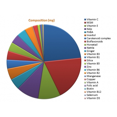 витамин С (в виде угольной кислоты), МСМ, витамин Е (натуральный d-альфа-токоферол) водоросли, ПАБА, инозитол, каротиноидный комплекс (натуральный), биофлавоноидный комплекс, хвощ полевой (хвощ), крапива (крапивница), имбирь, витамин B3 (в виде никотинамида), Каротиноидный комплекс (натуральный), кремний (в виде кремнезема), витамин B5 (в виде пантотената кальция), цинк (в виде цитрата), витамин B6 (в виде пиридоксина HCl), витамин B2 (в виде рибофлавина), витамин B1 (в виде тиамина HCl), марганец (в виде цитрата), витамин A, медь (в виде глюконата), фолиевая кислота, Биотин, витамин B12 (в виде цианокобаламина), селен (в виде селената натрия), витамин D3 (в виде холекальциферола), капсула: желатин.