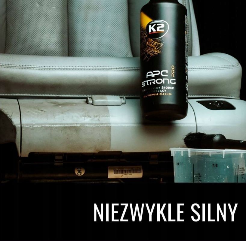 2. K2 APC Sonitg Pro 1L - сильный чистящий агент для интерьера и тела k2 apc out strong pro является чрезвычайно эффективным и универсальным чистящим средством для всех поверхностей автомобиля. Его можно использовать как во внутренней части, так и на внешних элементах транспортного средства. Он хорошо справляется с грязью на пластмассах, виниле, теле, шинах и дисках.