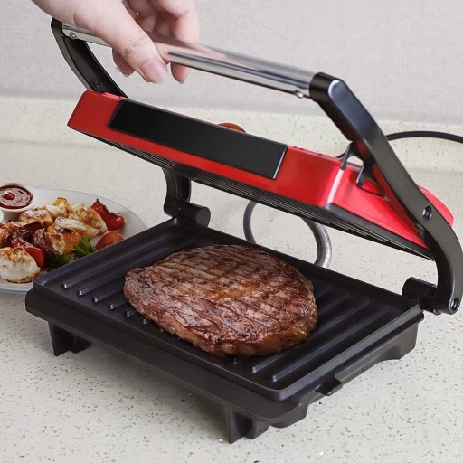 - Гриль, сэндвичница. Мощность 700 Вт, холодная ручка, антипригарное покрытие. Не содержит BPA, красный и черный цвет.