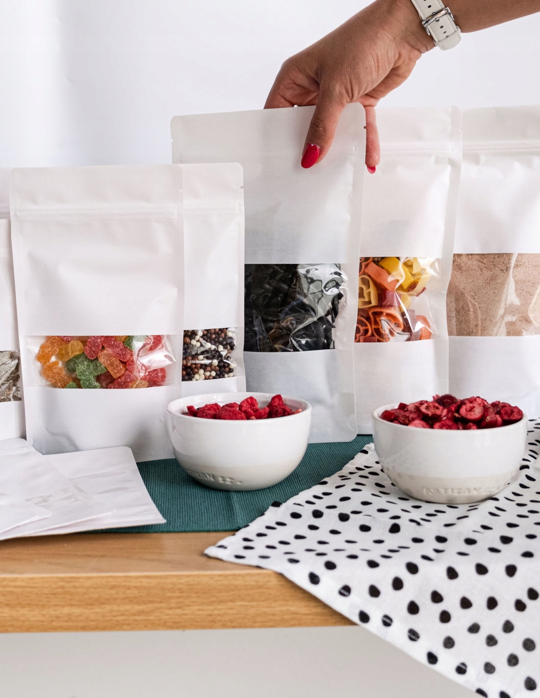 Эта упаковка изготовлена из комбинации бумаги, ПЭТ-пластика и пленки CPP. Все это выглядит как эстетичная и прочная сумка, которую с успехом можно использовать для упаковки различных продуктов. Окно в середине упаковки выполняет роль витрины – благодаря ему покупатель может внимательно рассмотреть товар перед его покупкой.